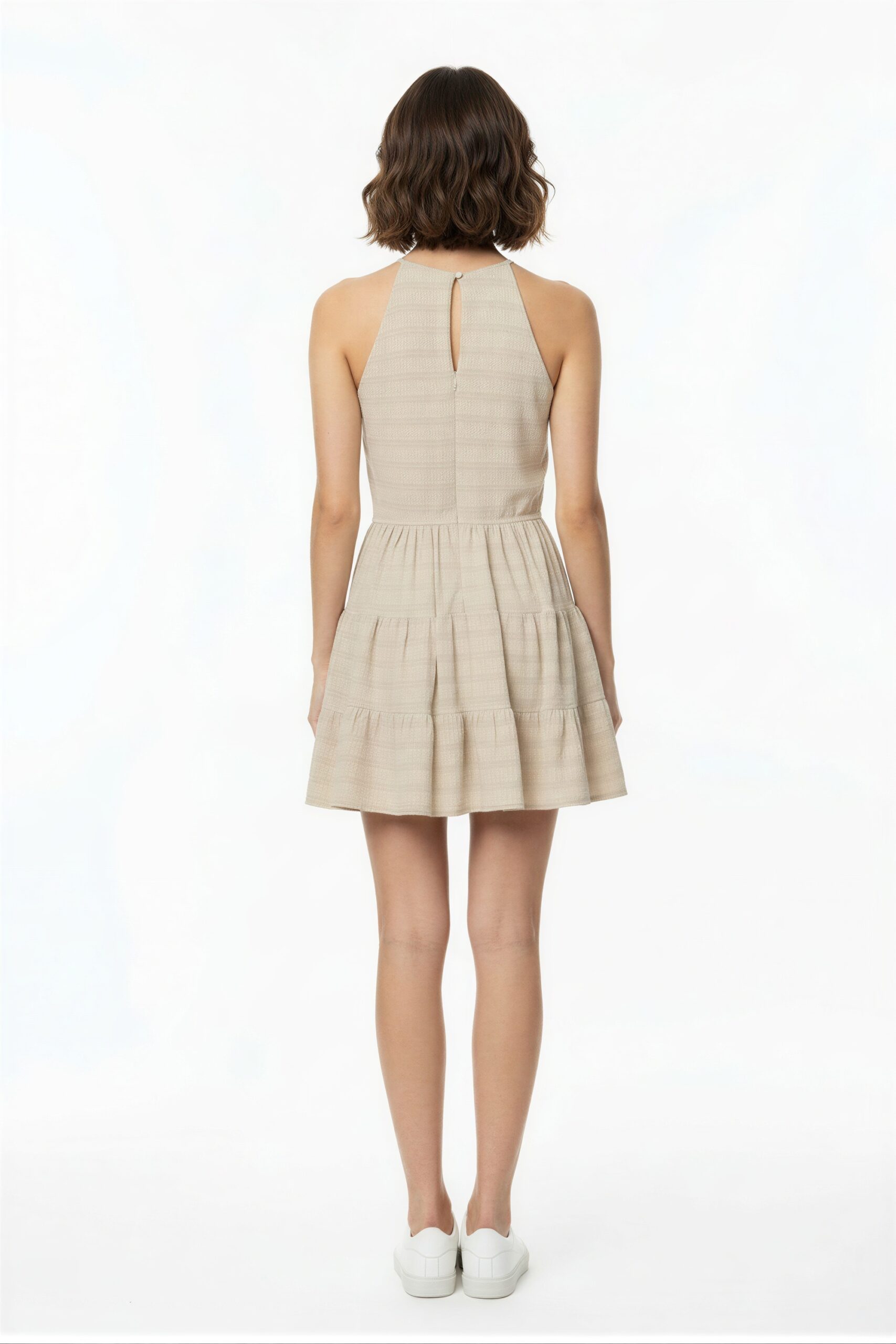 Vestido con cuello halter sin mangas con ajuste en cintura falda con volumen y caída ligera diseño con abertura posterior