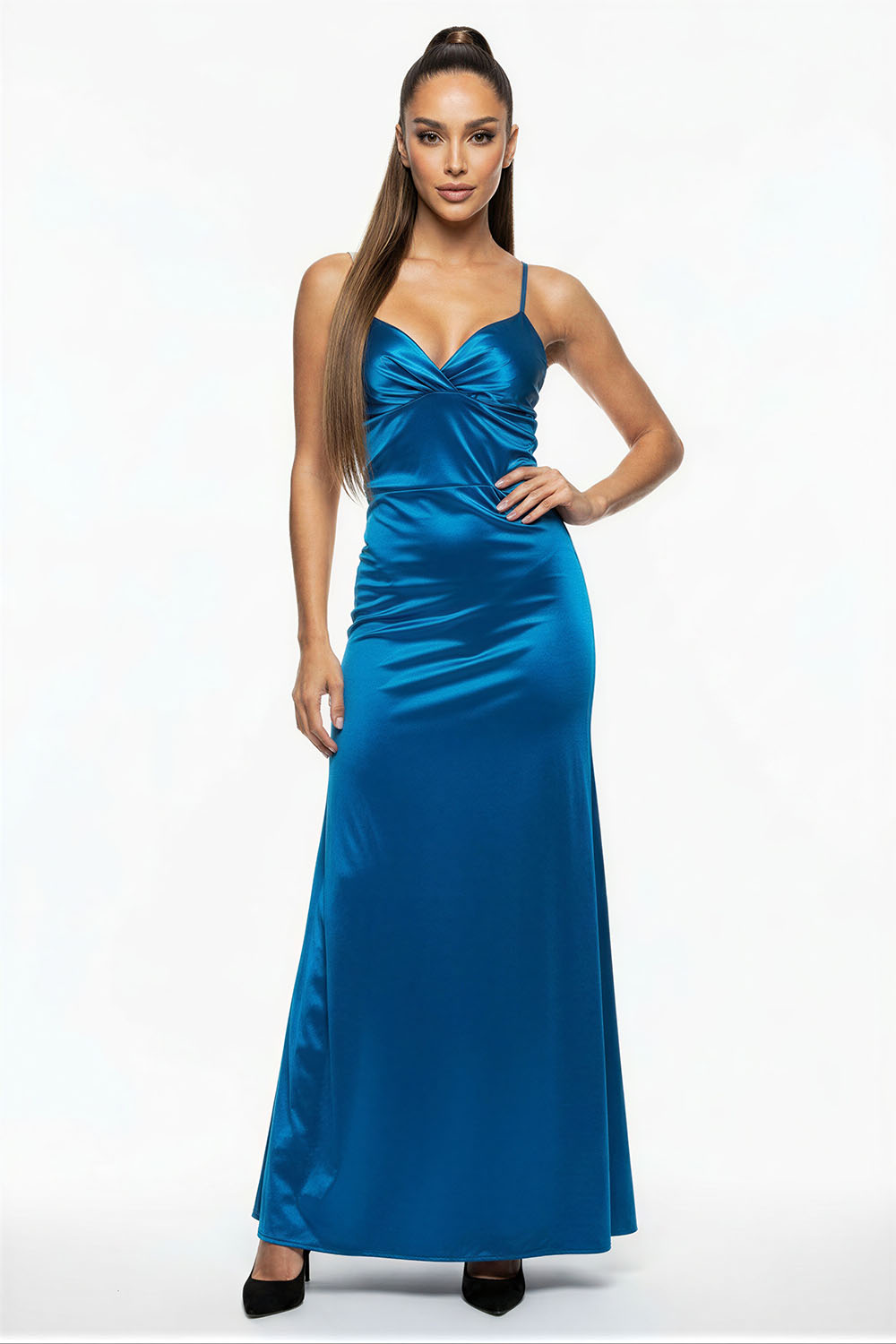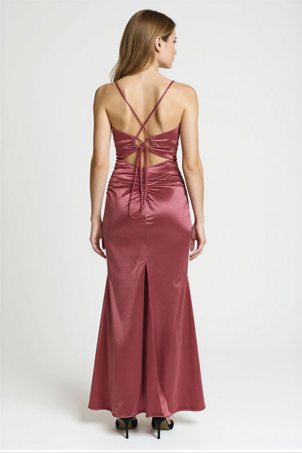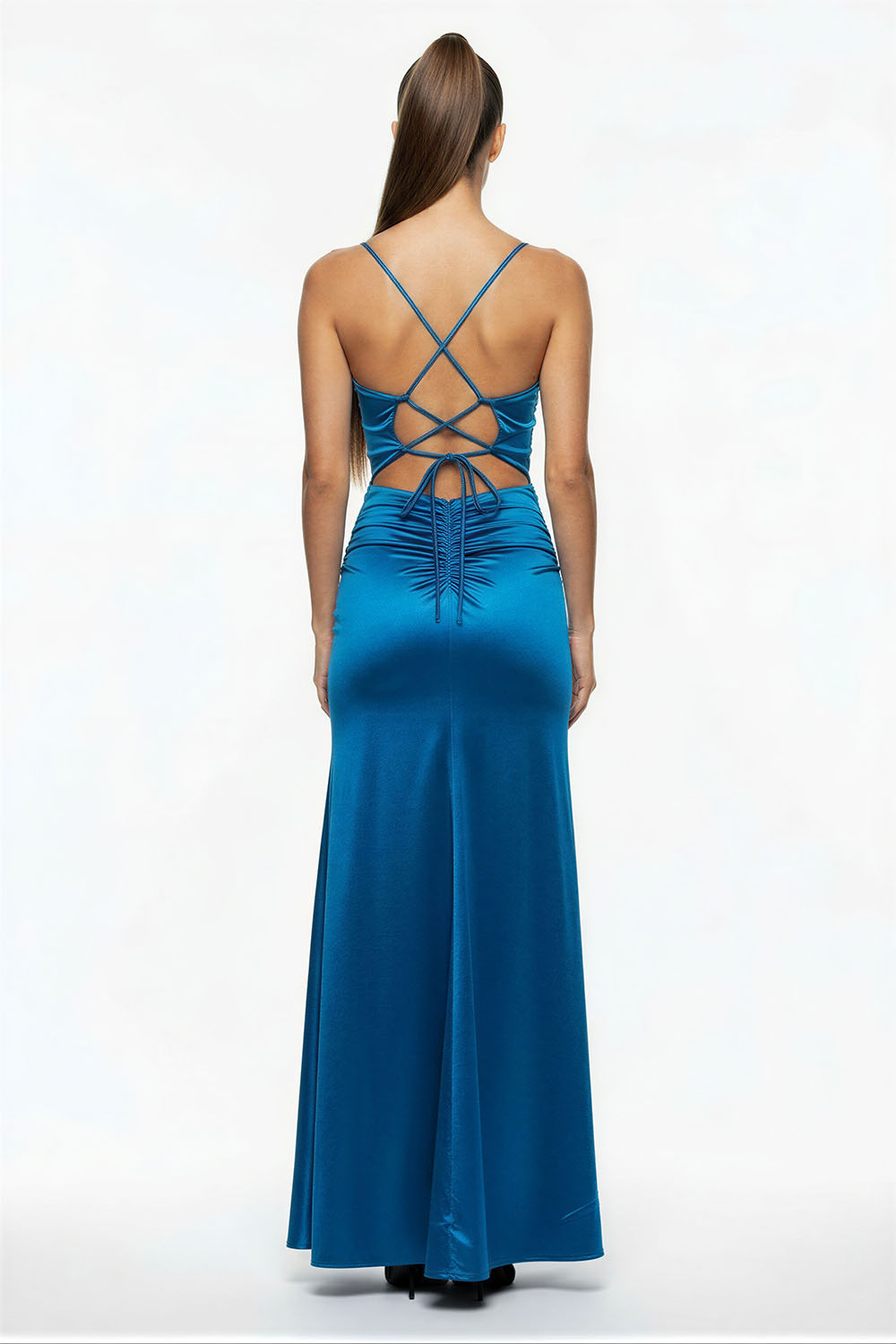 Vestido largo con silueta ajustada que realza la figura, escote en forma cruzada con tirantes delgados que aportan soporte, confección en tejido satinado con acabado suave que brinda fluidez, espalda descubierta con tiras entrelazadas ajustables que permiten mejor ajuste, detalle fruncido en cintura que estiliza y define la forma