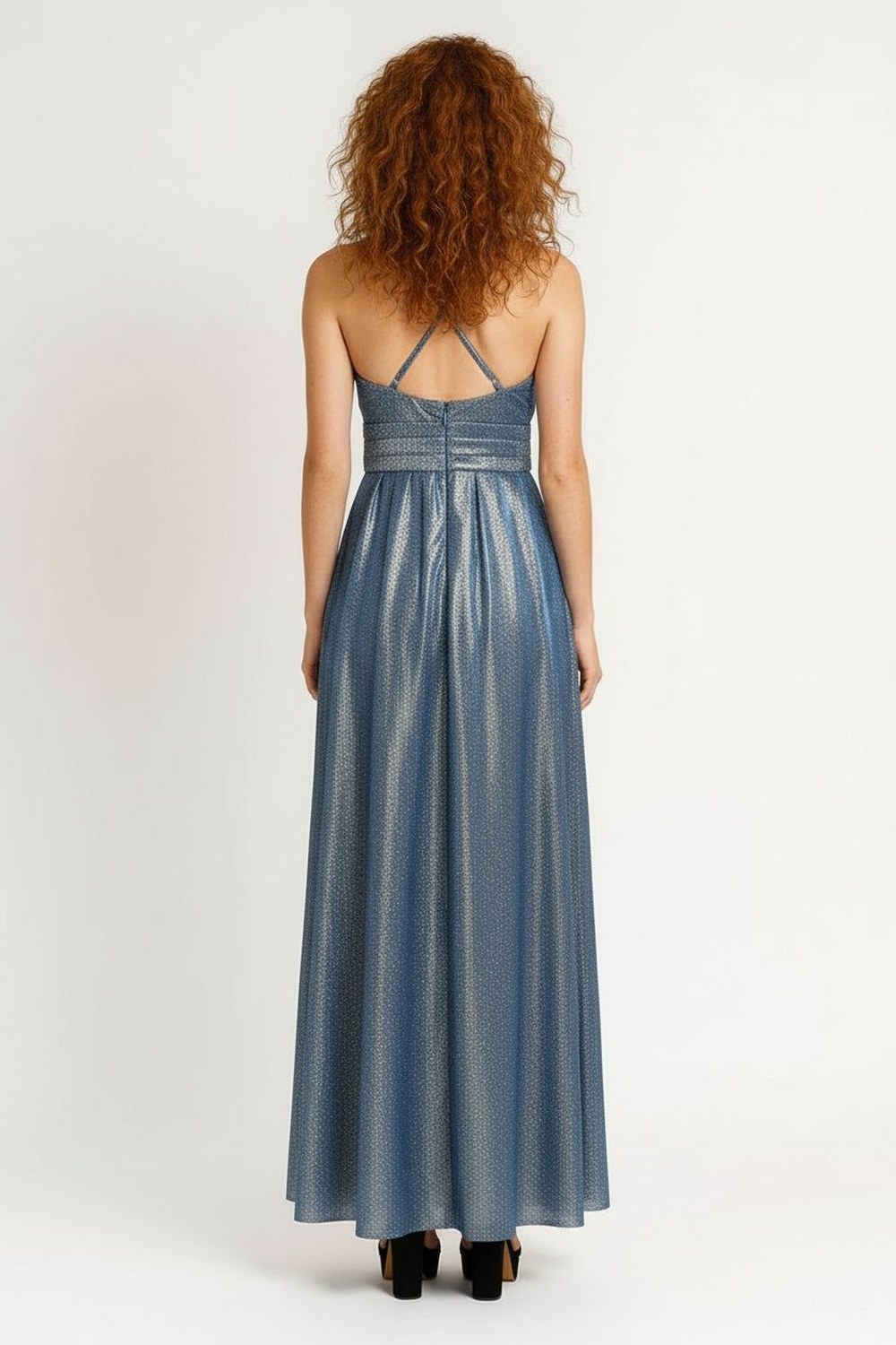 Vestido largo con tirantes delgados ajustables y escote en V, confección en tejido con efecto brillante que realza la silueta, espalda con cruce de tiras y ajuste mediante cinta, falda amplia con caída fluida que aporta movimiento y elegancia, forro interno suave para mayor comodidad