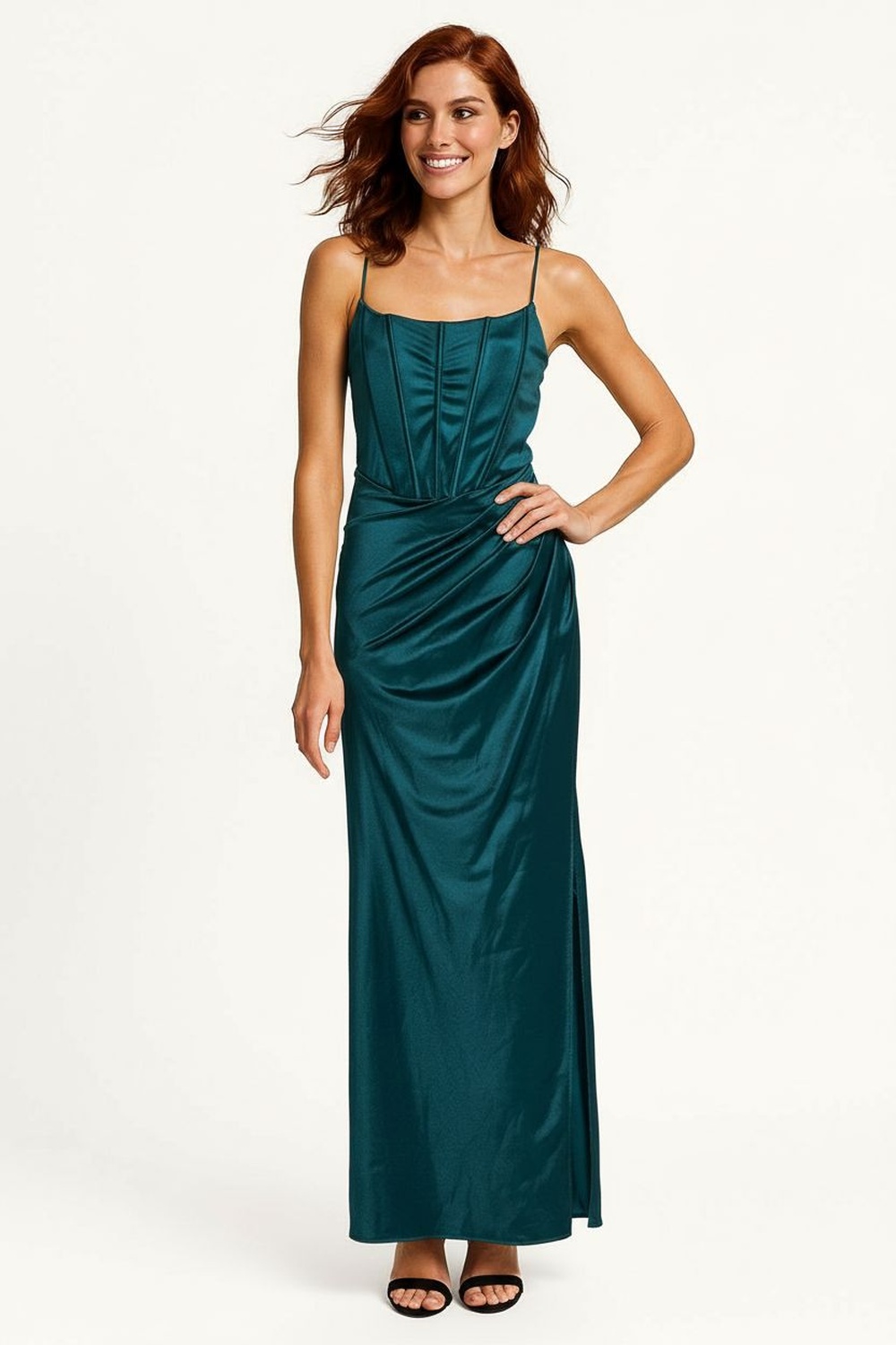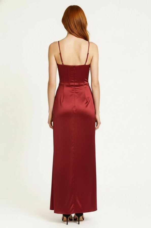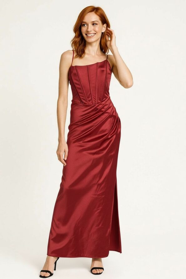 Vestido largo de tirantes delgados con estructura de varillas que define el busto, drapeado frontal que estiliza la figura, abertura lateral que aporta un toque elegante y sensual, confeccionado en tejido elástico con acabado brillante que brinda ajuste y comodidad