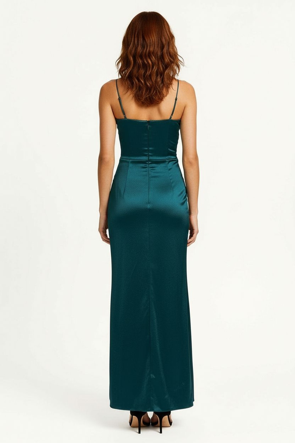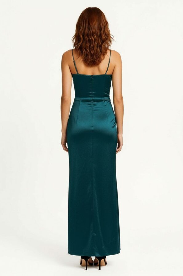 Vestido largo de corte elegante con escote en V profundo que realza la silueta, tirantes delgados ajustables que brindan soporte y comodidad, falda amplia con abertura lateral que facilita el movimiento y aporta un toque sofisticado, confección en tela fluida con acabado brillante que aporta estilo refinado y presencia destacada, dobladillo recto que asegura caída natural y favorecedora
