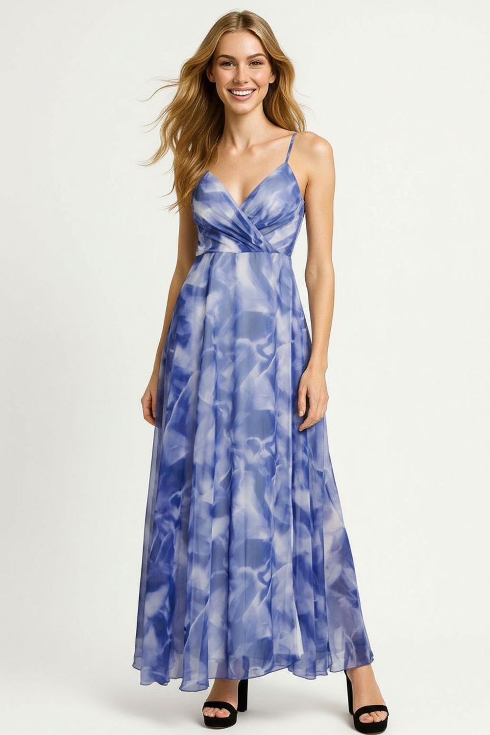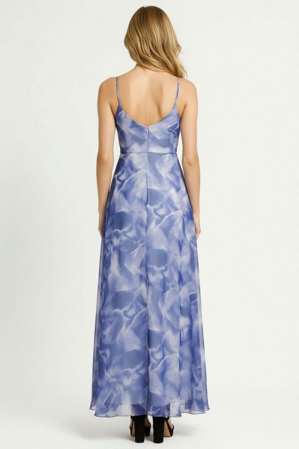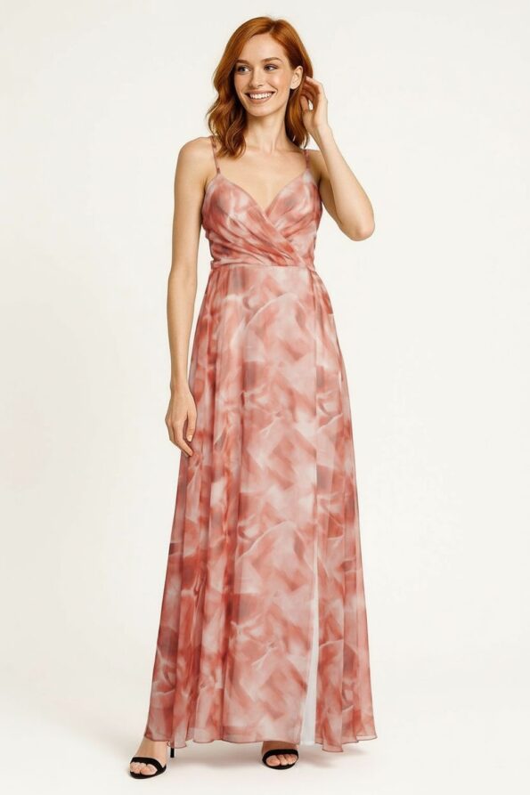 Vestido largo con diseño cruzado en el pecho que realza el escote, tirantes delgados ajustables que ofrecen soporte cómodo, cintura definida que estiliza la silueta, falda amplia con caída fluida que aporta movimiento natural al caminar, confección en tejido ligero de acabado suave ideal para ocasiones especiales de día
