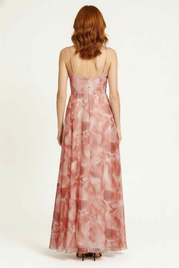 Vestido largo de corte elegante con escote en V profundo que realza la silueta, tirantes delgados ajustables que brindan soporte y comodidad, falda amplia con abertura lateral que facilita el movimiento y aporta un toque sofisticado, confección en tela fluida con acabado brillante que aporta estilo refinado y presencia destacada, dobladillo recto que asegura caída natural y favorecedora