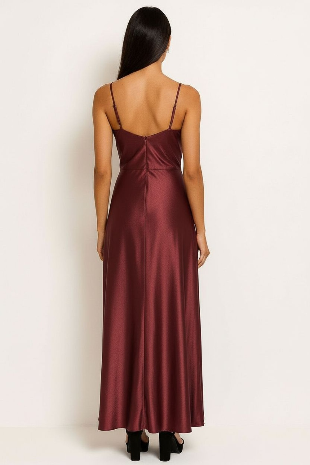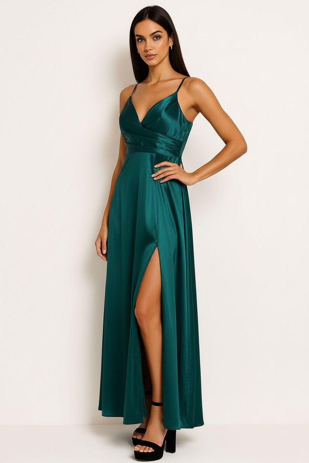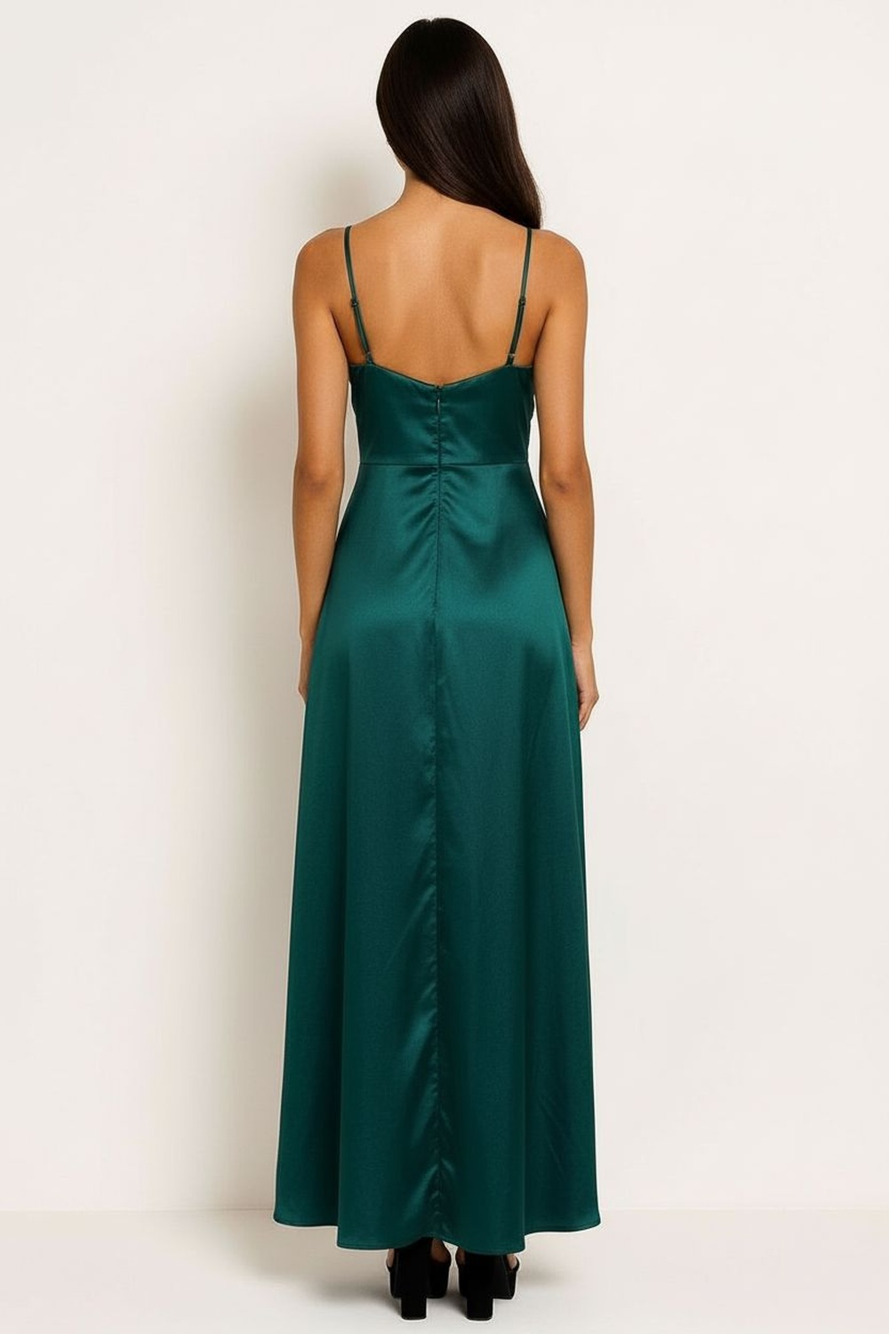 Vestido largo con escote en V cruzado al frente que define la silueta, tirantes delgados que ofrecen soporte ligero y ajuste cómodo, cintura marcada con corte estratégico que realza proporciones, falda amplia de caída fluida con largo al piso que aporta presencia y elegancia, confección en tejido satinado de acabado suave al tacto