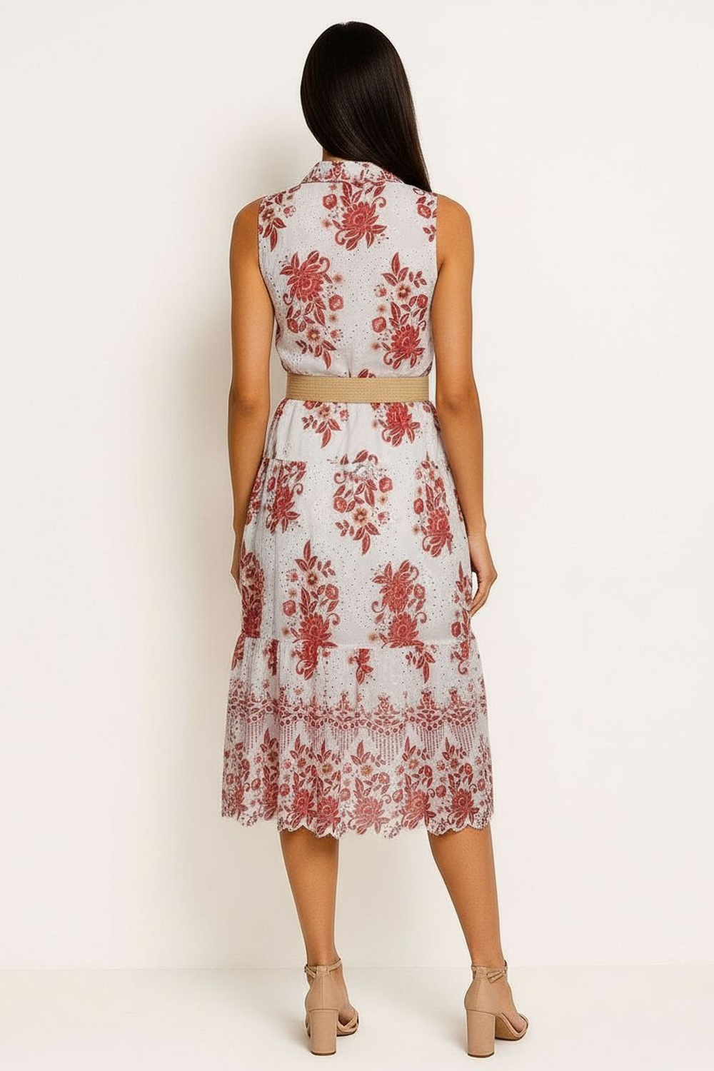 Vestido largo sin mangas cuello camisero botonadura frontal cinturón para ajustar en cintura falda amplia caída fluida terminación recta