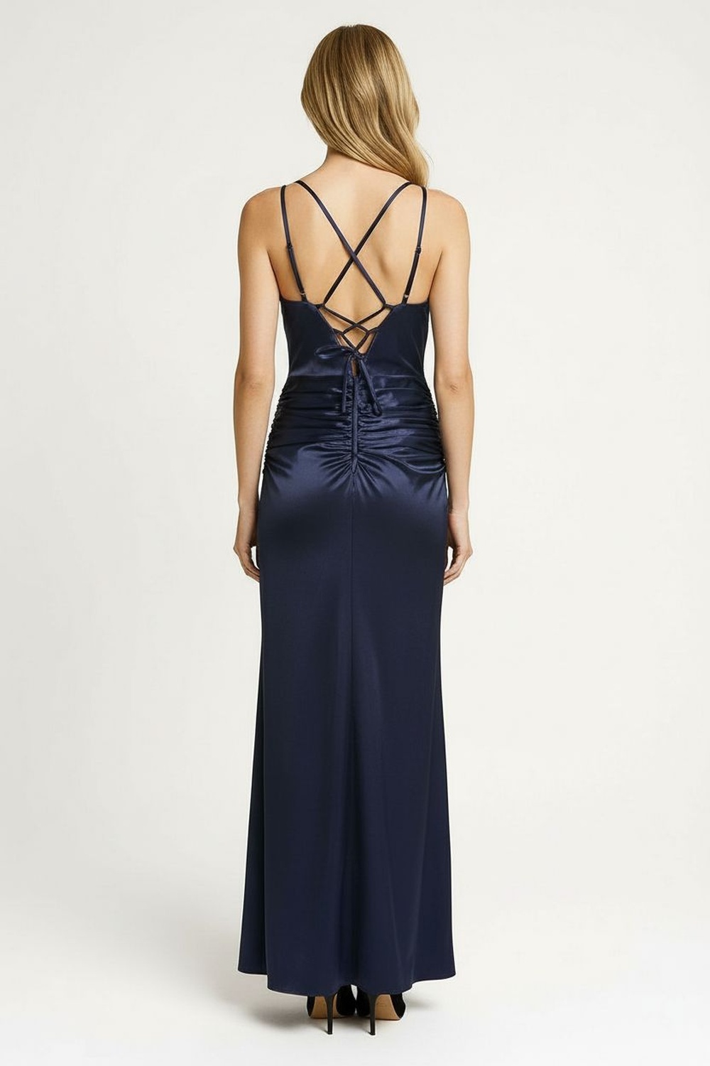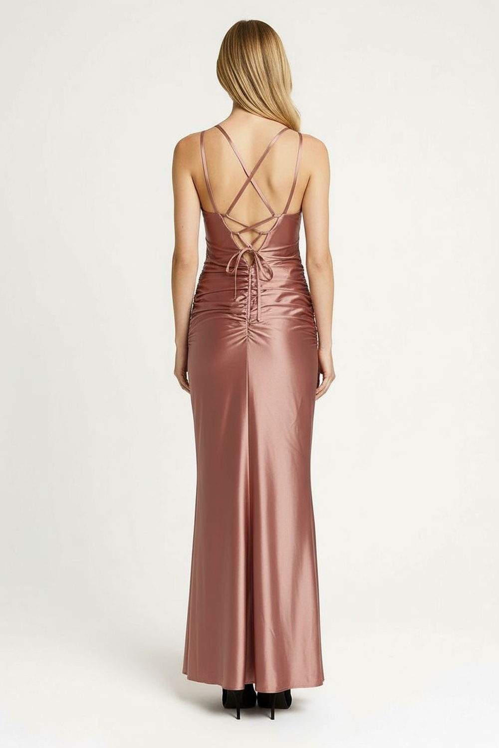 Vestido largo confeccionado en tejido elástico con acabado brillante, escote drapeado con tiras delgadas que aportan un toque sofisticado, diseño ajustado que realza la silueta, abertura lateral que otorga movimiento y estilo elegante, espalda descubierta con caída fluida que aporta distinción en cada paso