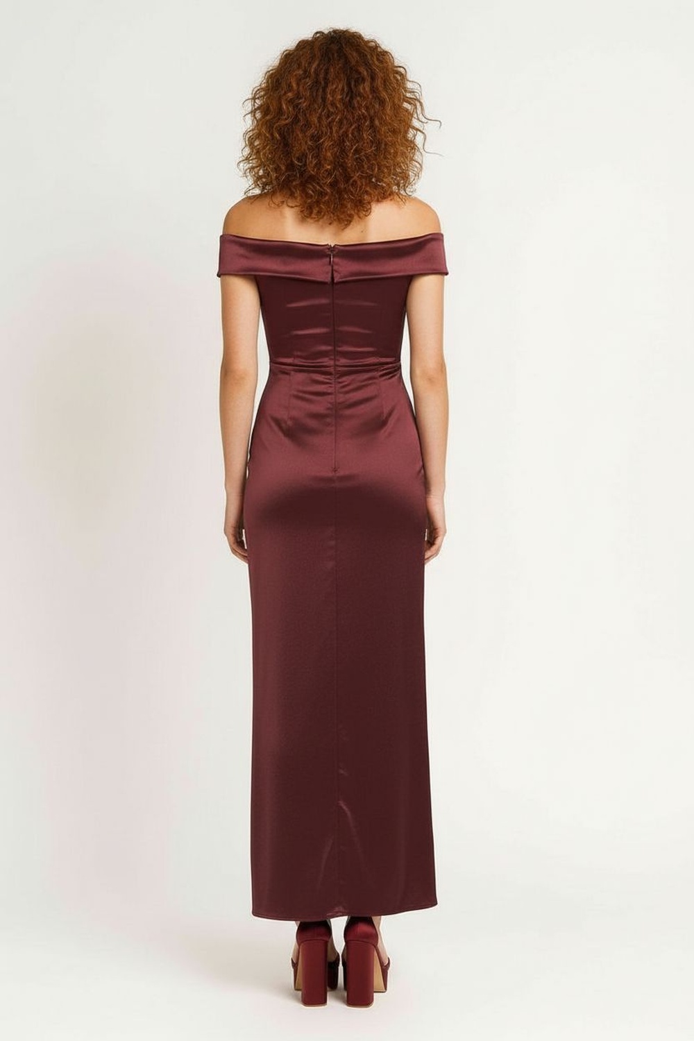 Vestido largo de fiesta con escote off shoulder que resalta los hombros de manera elegante, tirantes delgados que brindan soporte adicional y un ajuste seguro, diseño fruncido lateral que estiliza la silueta y realza la figura, falda con abertura frontal que aporta sofisticación y libertad de movimiento, confección en tela fluida con acabado brillante que otorga un look distinguido y versátil para ocasiones especiales