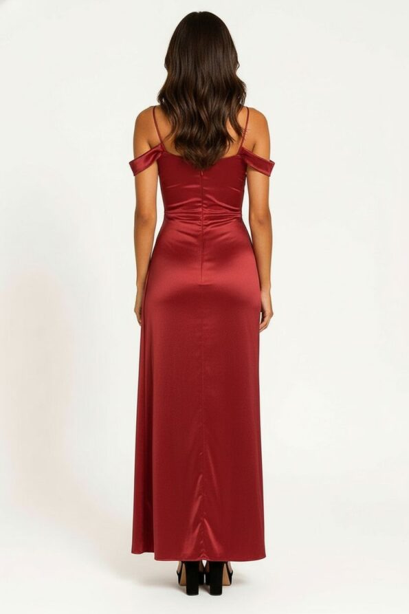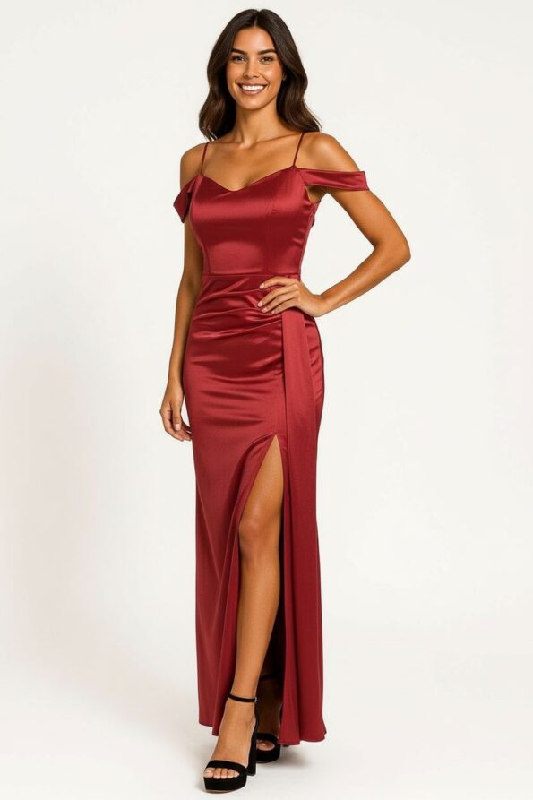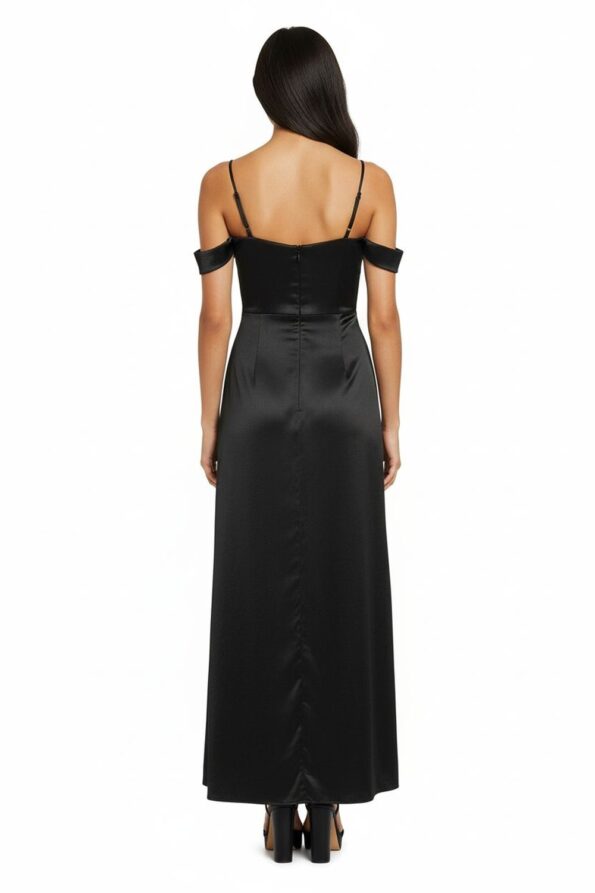Vestido largo con tirantes anchos y escote recto que realza la figura, drapeado lateral que estiliza el cuerpo y genera un efecto envolvente, abertura frontal que añade movimiento y sensualidad, confeccionado en tejido elástico con acabado brillante que aporta elegancia y confort
