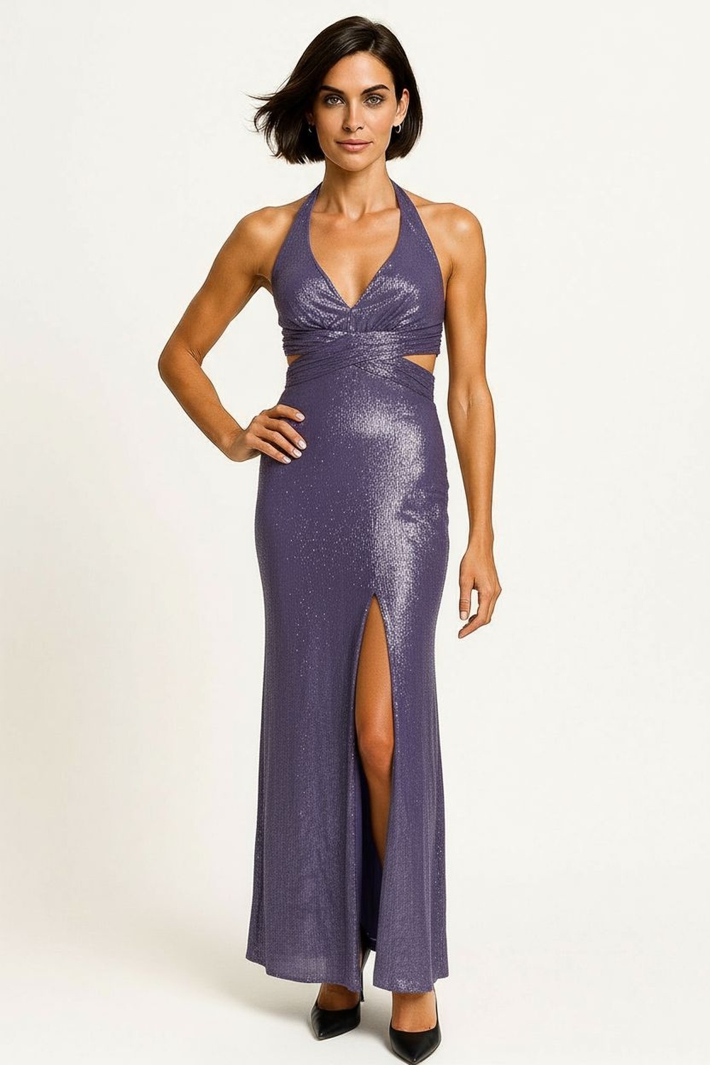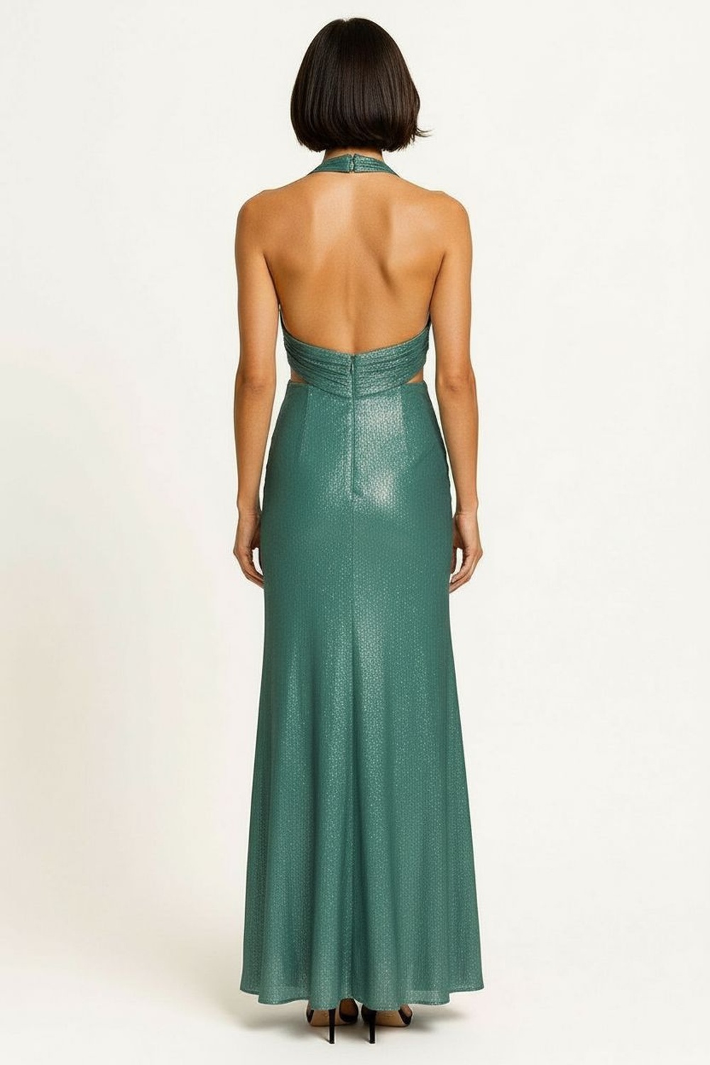 Vestido largo halter escote profundo drapeado al frente cintura definida falda larga con abertura lateral espalda descubierta confección ligera caída fluida