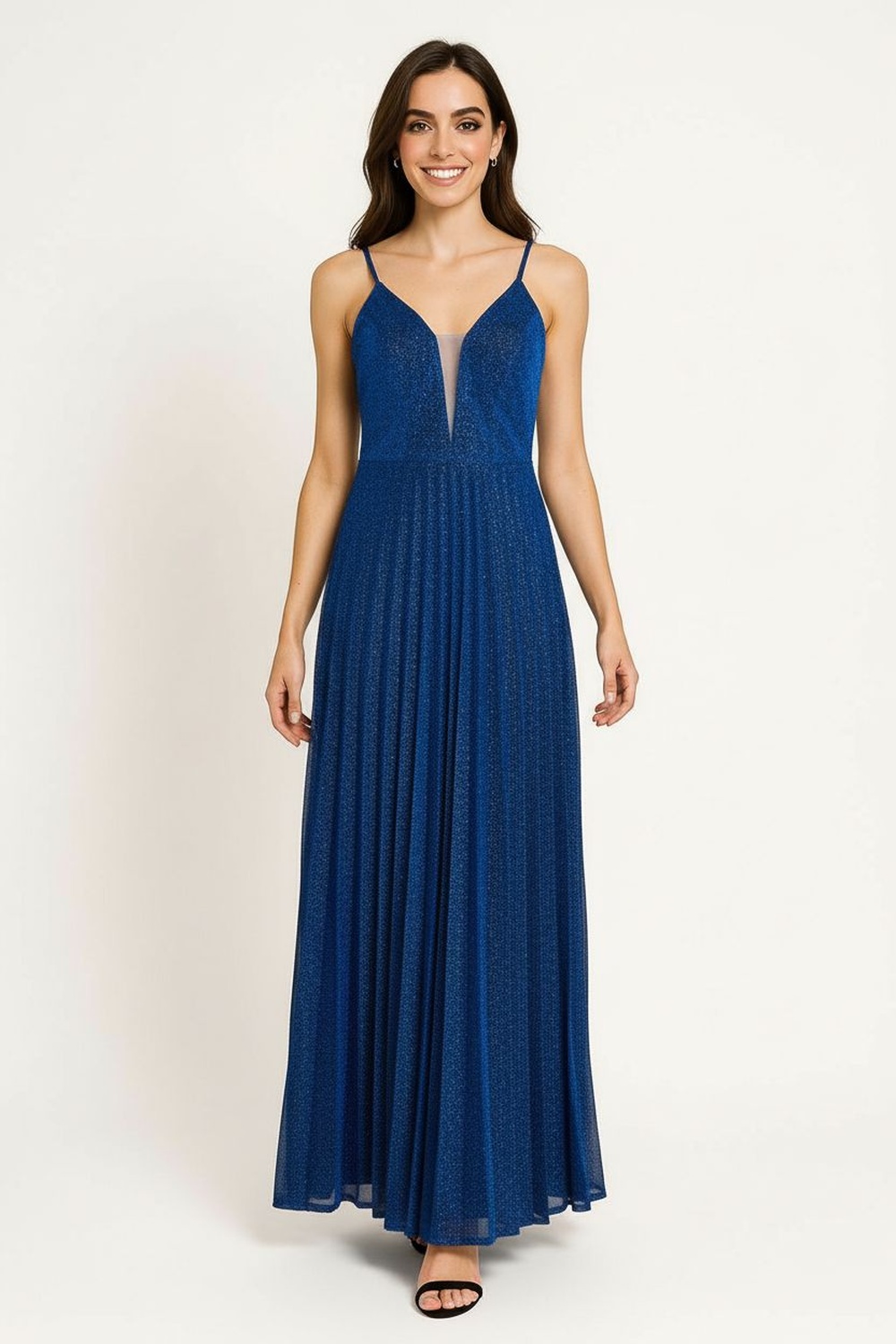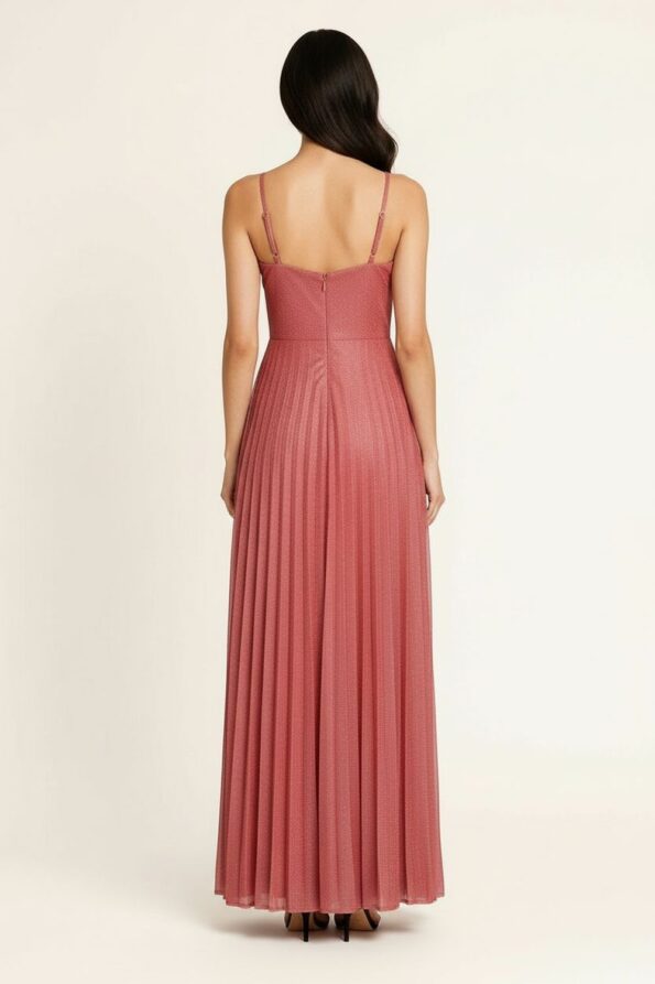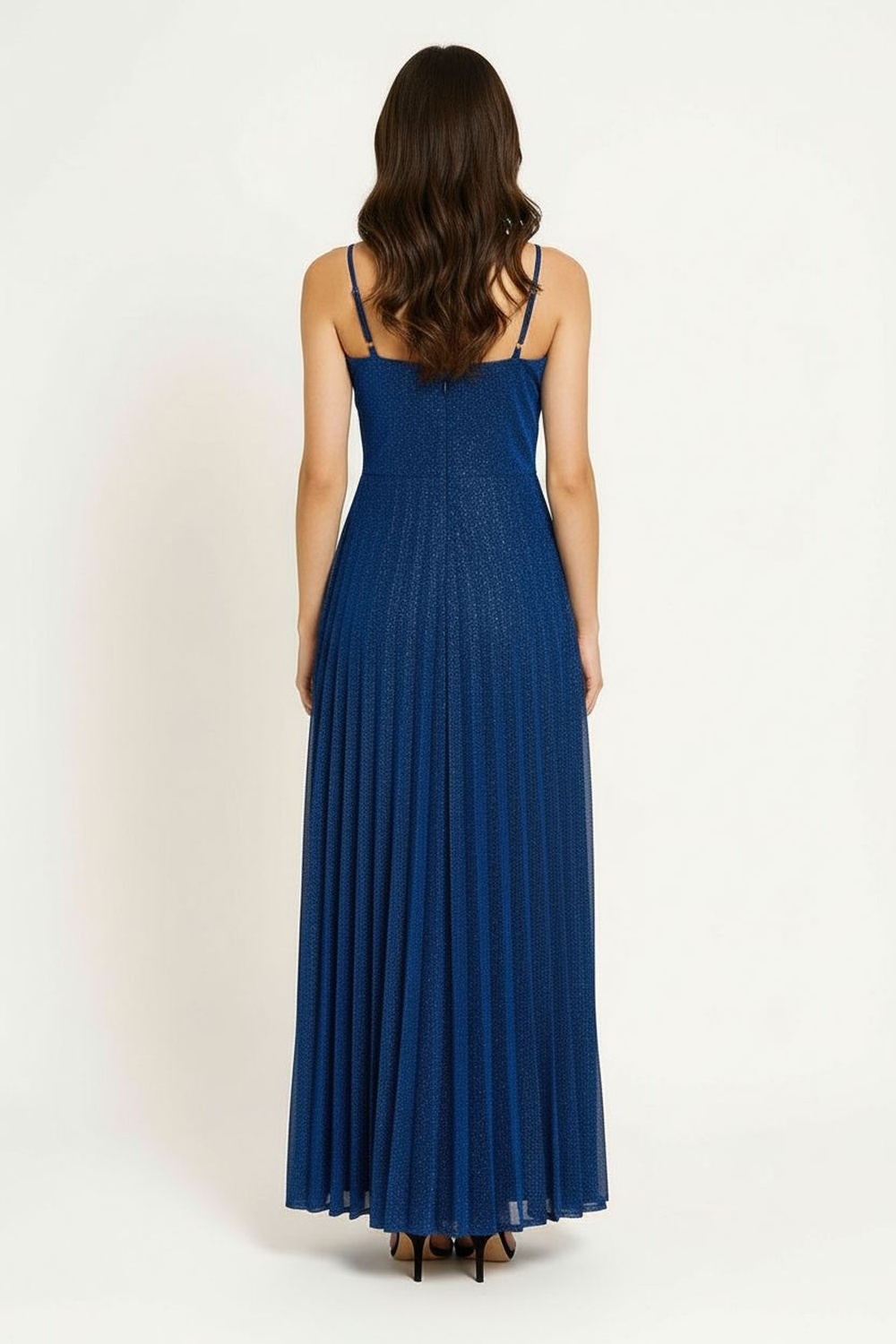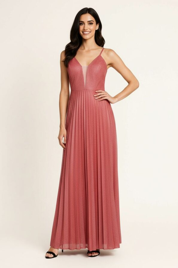 Vestido largo con tirantes delgados que realzan los hombros, escote en V profundo con malla discreta que aporta un toque elegante, cintura ajustada que define la silueta, falda plisada con caída amplia que genera movimiento y fluidez, confección en tejido con sutil brillo que añade un acabado sofisticado ideal para eventos especiales