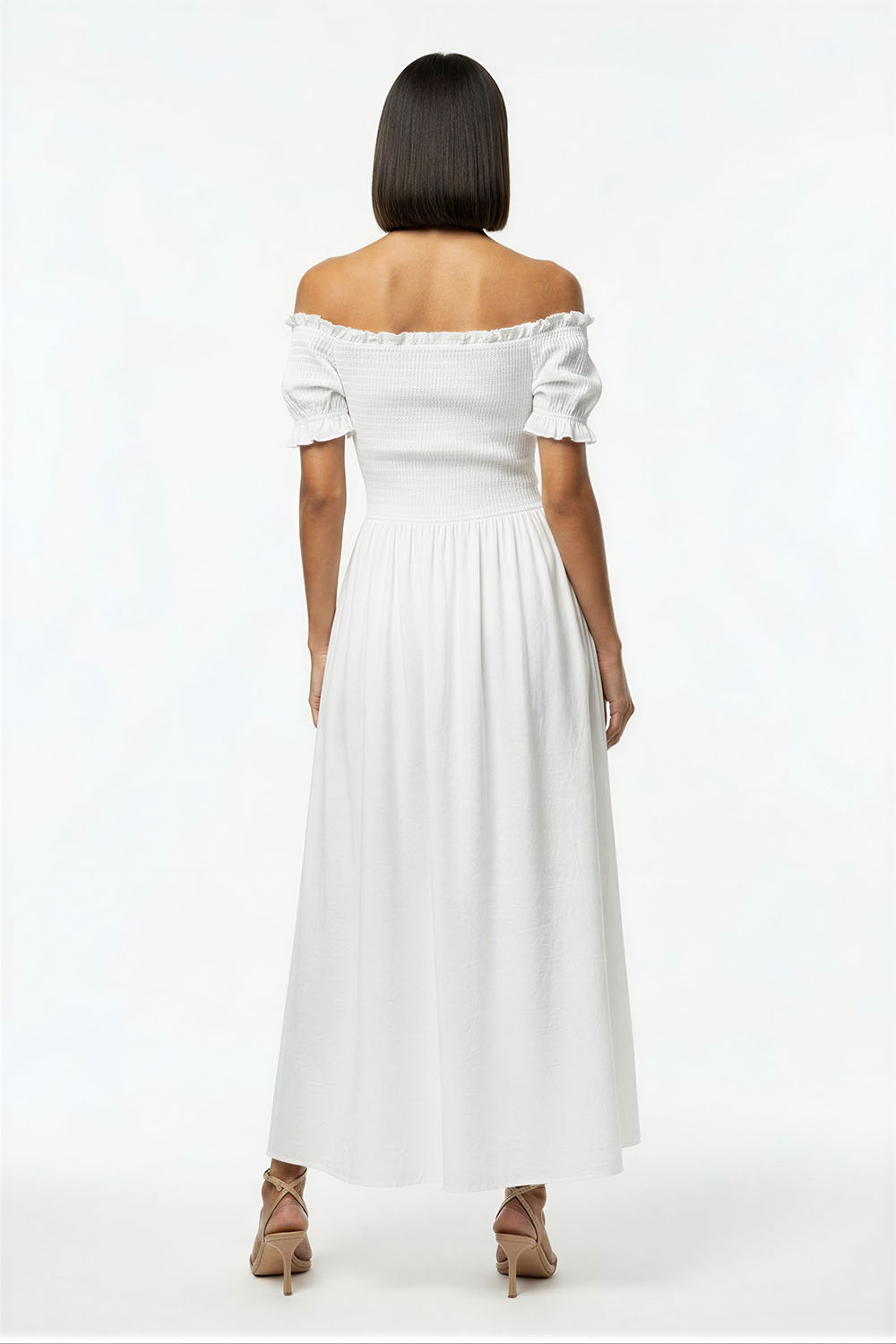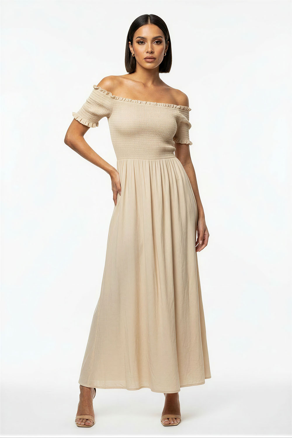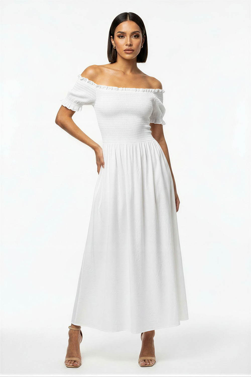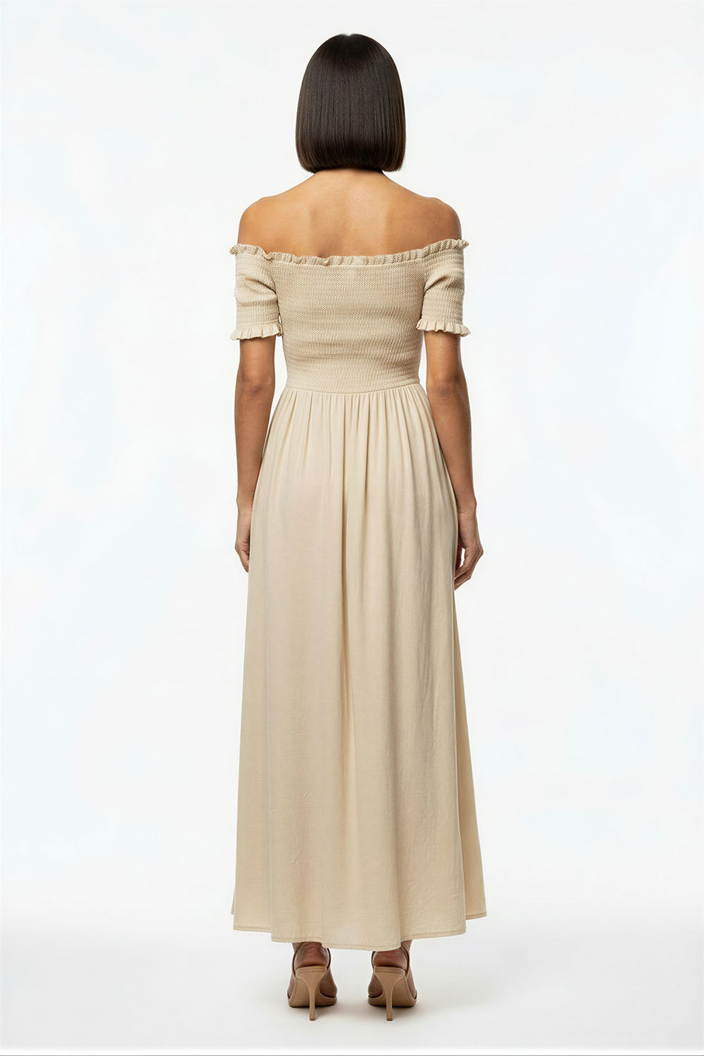 Vestido largo con cuerpo tipo smock que se ajusta al torso, manga corta con elástico que brinda comodidad en brazos, escote amplio que aporta frescura, falda de caída amplia con movimiento ligero, confección suave que permite uso prolongado sin incomodidad