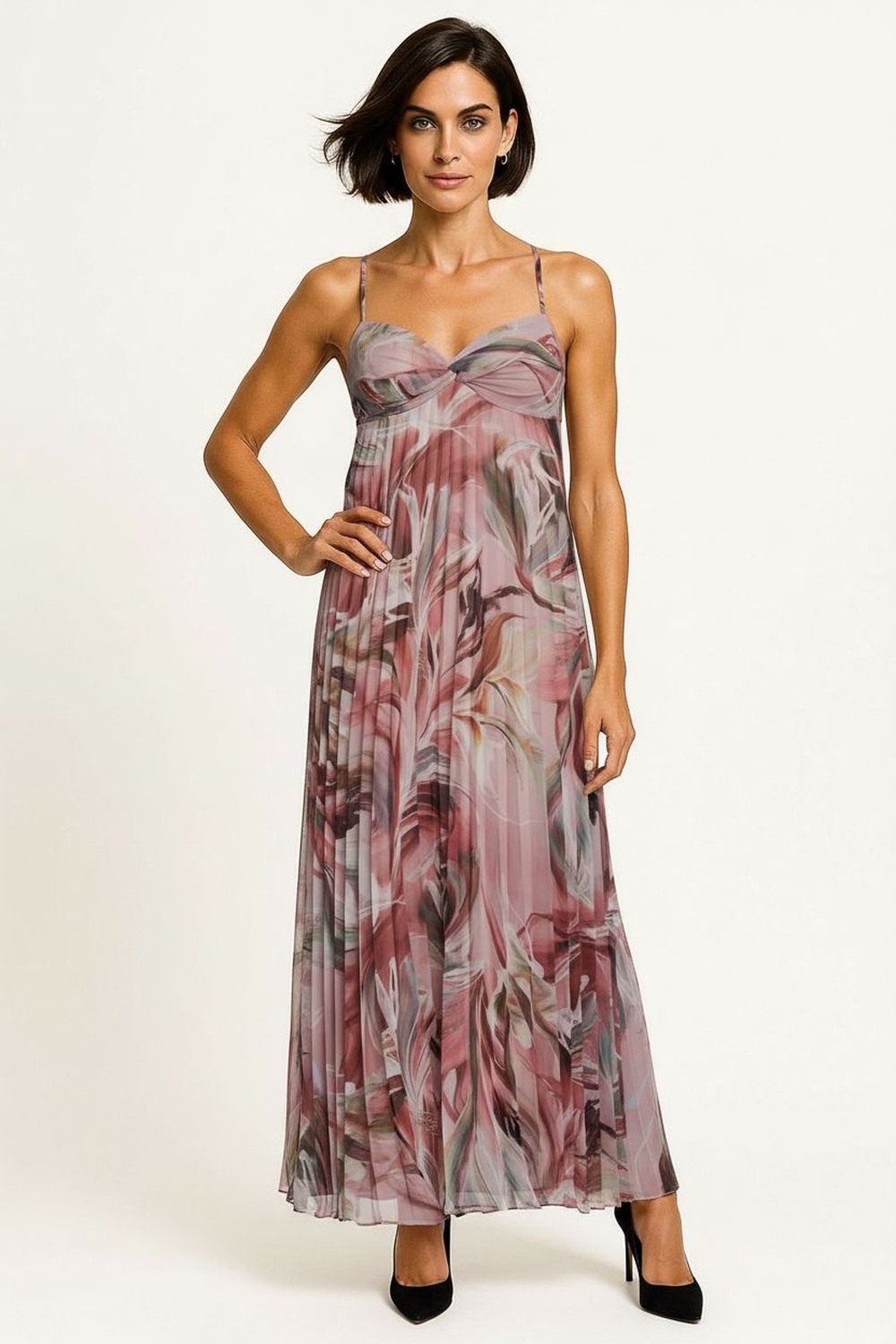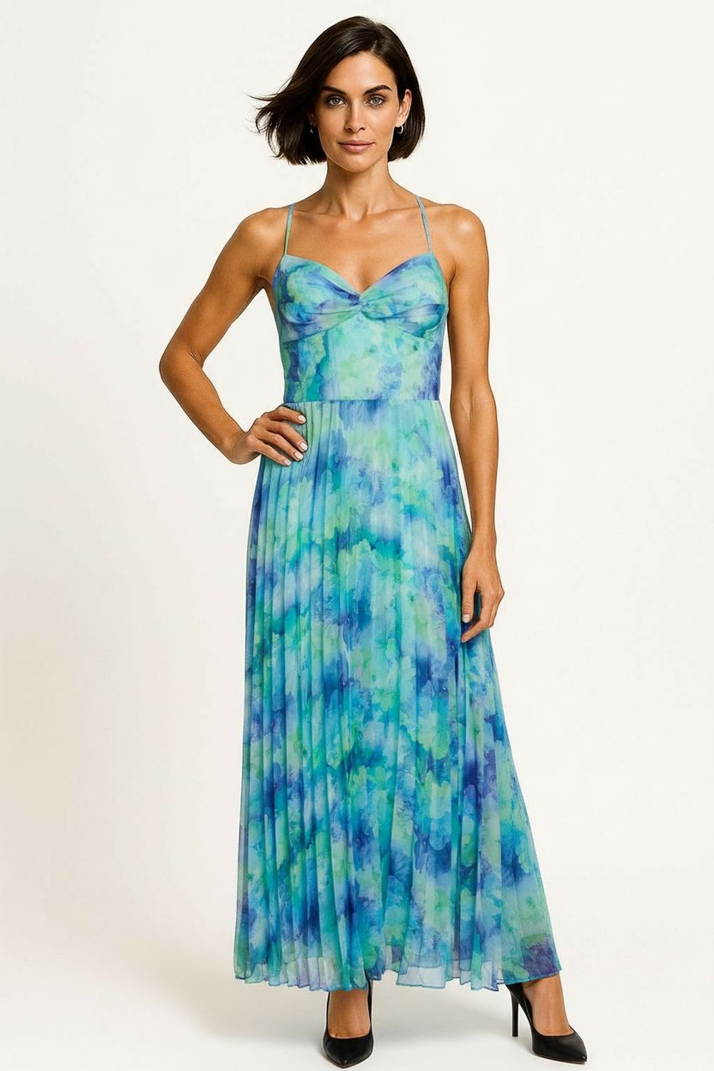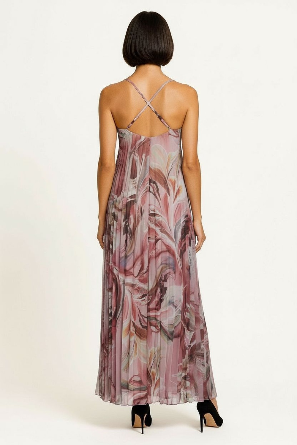 Vestido largo tirantes delgados escote pronunciado drapeado al frente espalda descubierta con tirantes cruzados falda amplia caída ligera terminación suave confección fluida