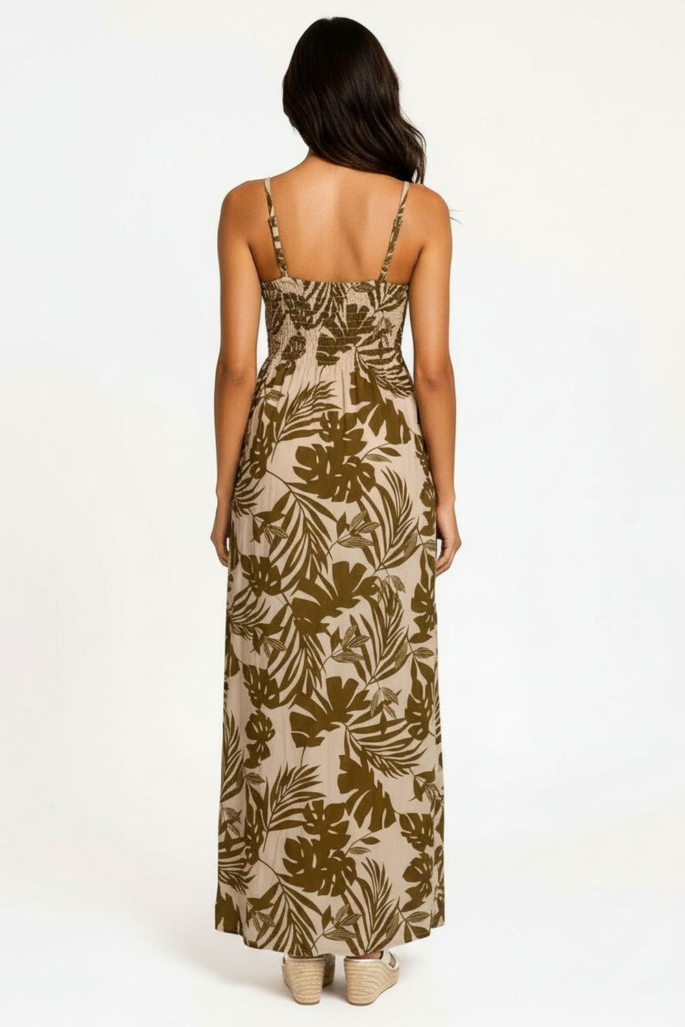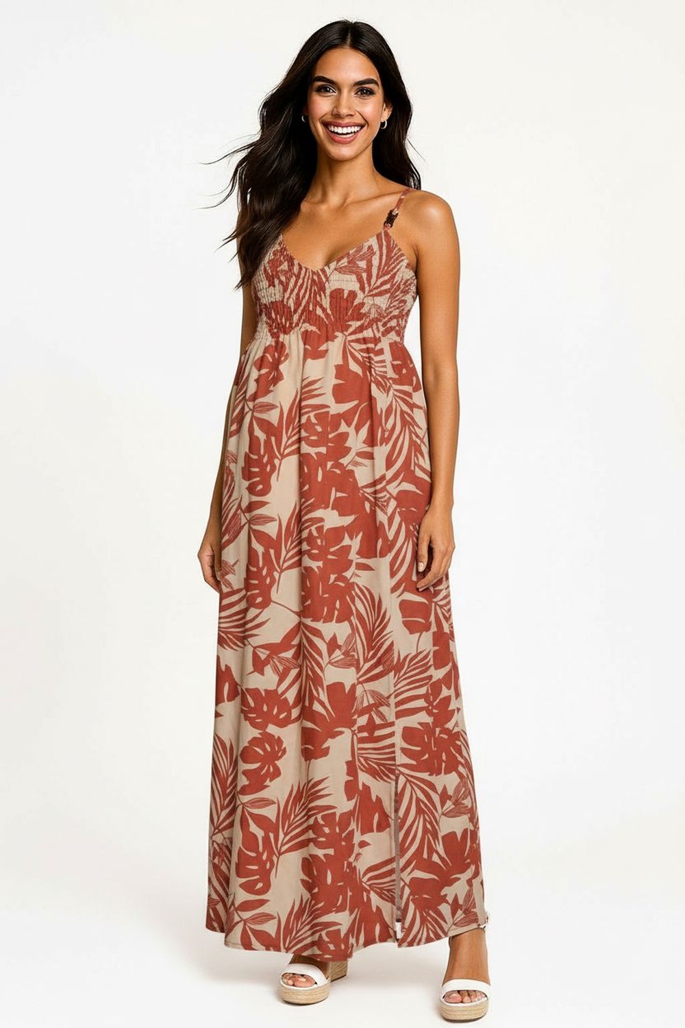 Vestido largo con tirantes delgados y escote en V que realza la parte superior, silueta semiajustada en la parte superior con falda de caída ligera, confección en tela fresca de tacto suave que permite comodidad prolongada, largo hasta el tobillo con movimiento fluido al caminar