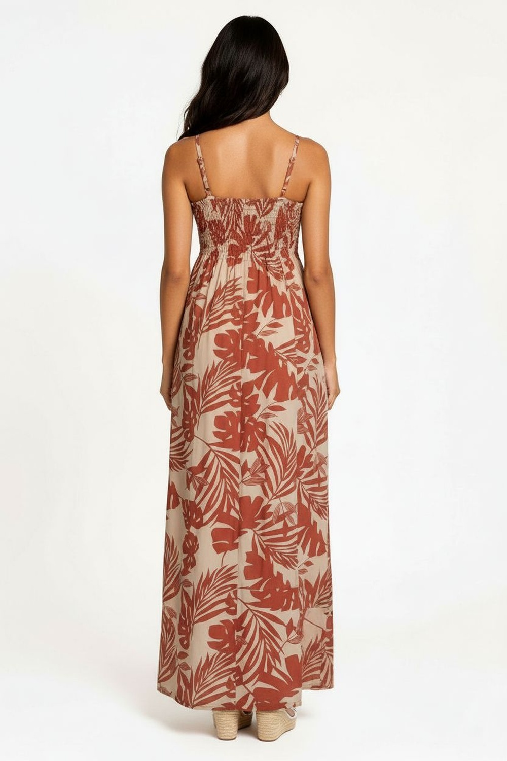 Vestido largo escote redondo, tirantes delgados ajustables, trabas con jareta de amarre, faldón al ruedo, diseño estampado contraste