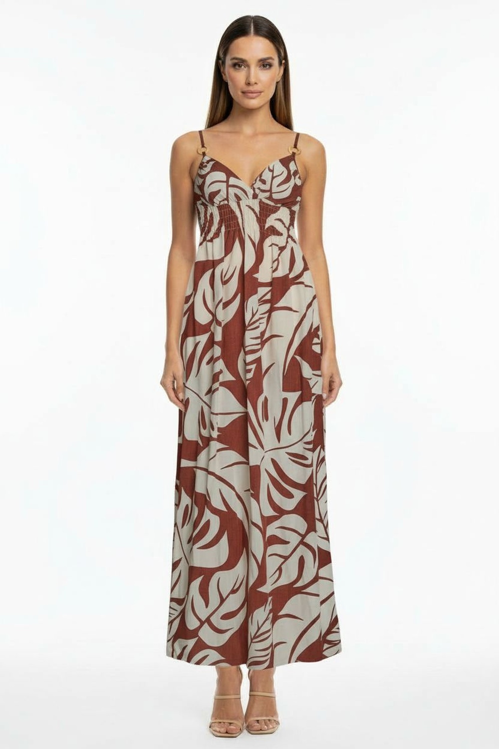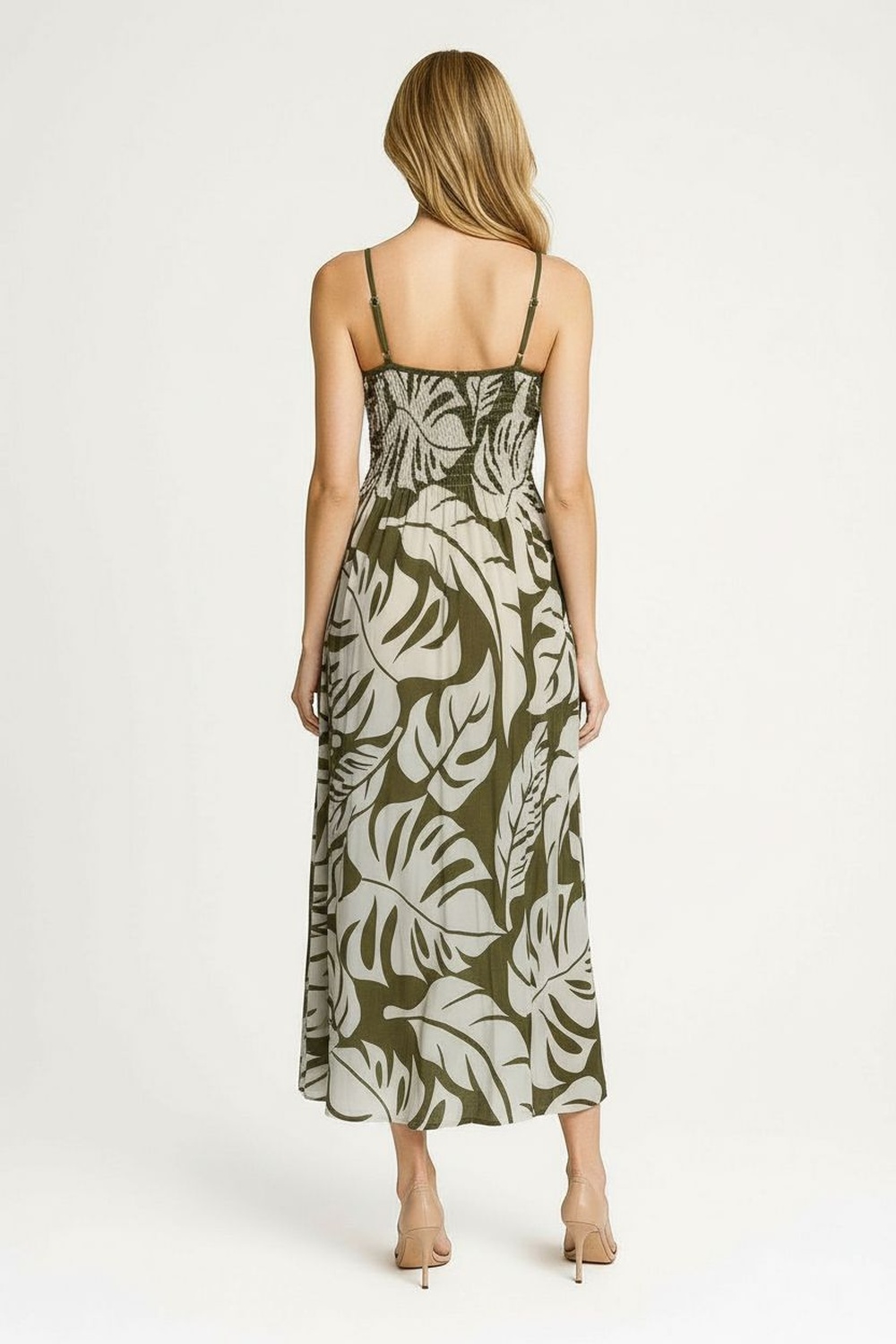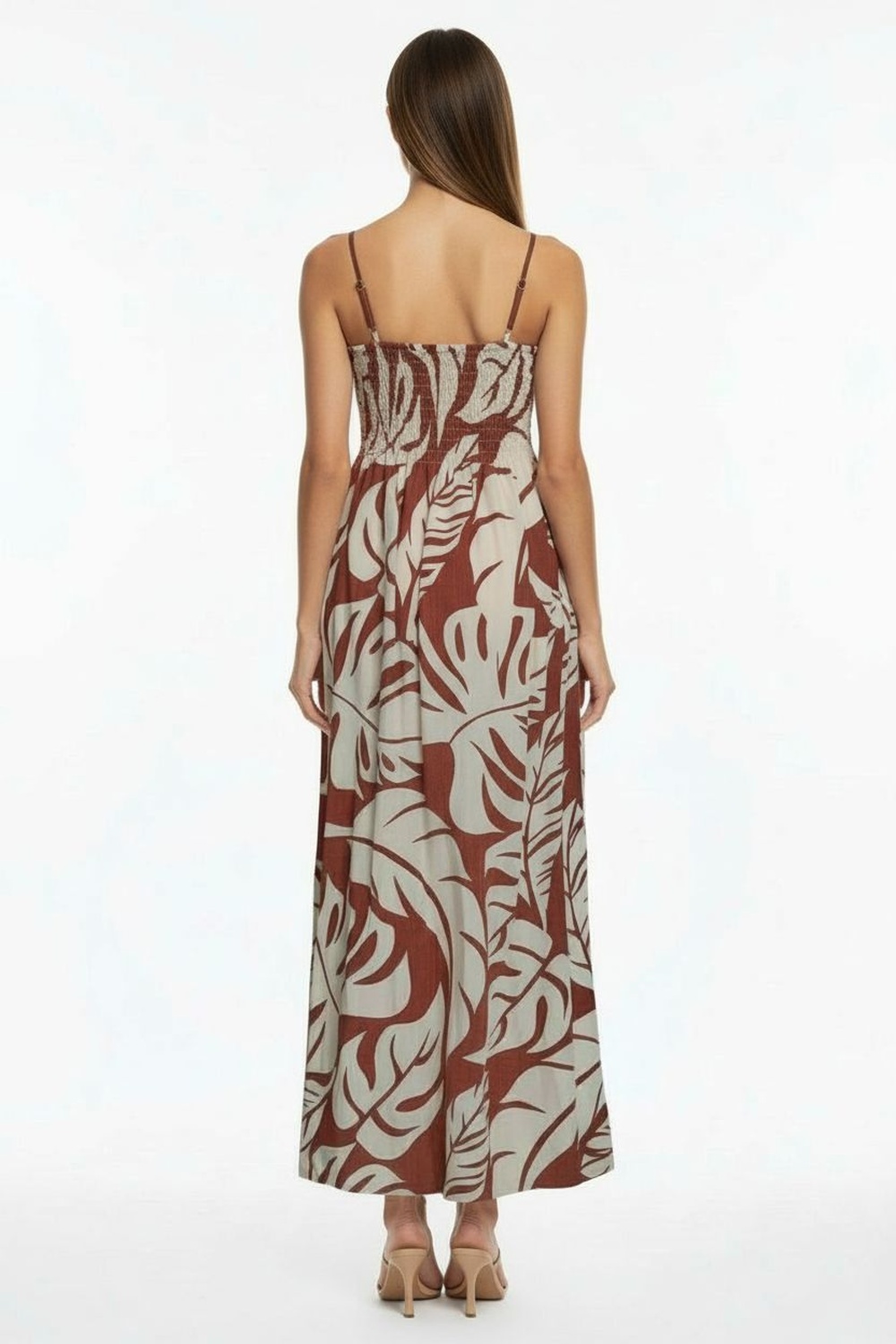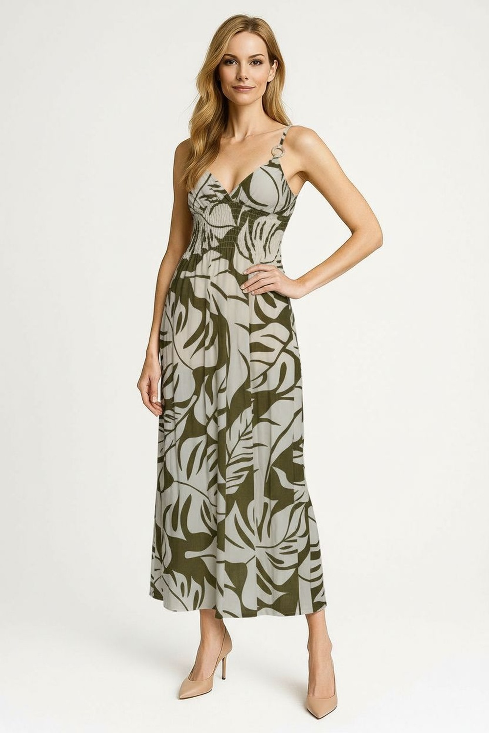 Vestido largo con tirantes delgados, escote en V, corte amplio, caída fluida, estructura ligera, ajuste cómodo al cuerpo