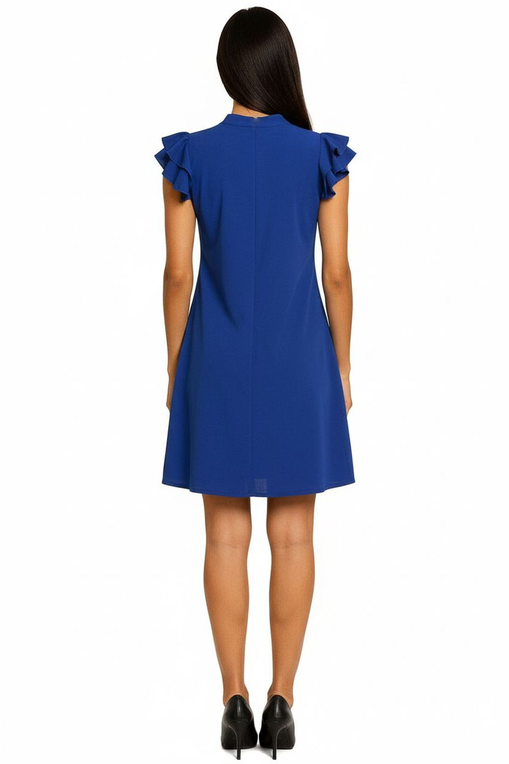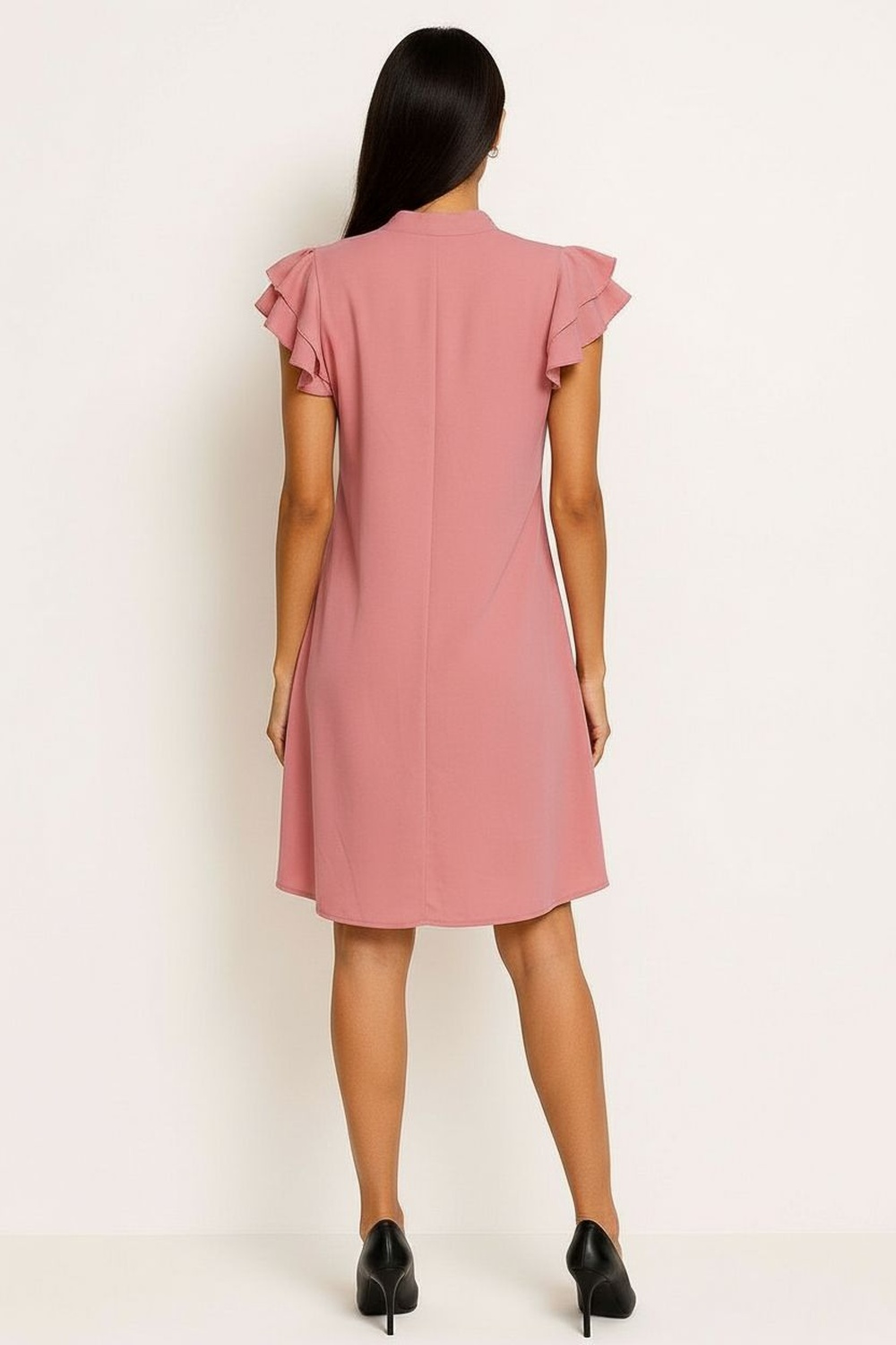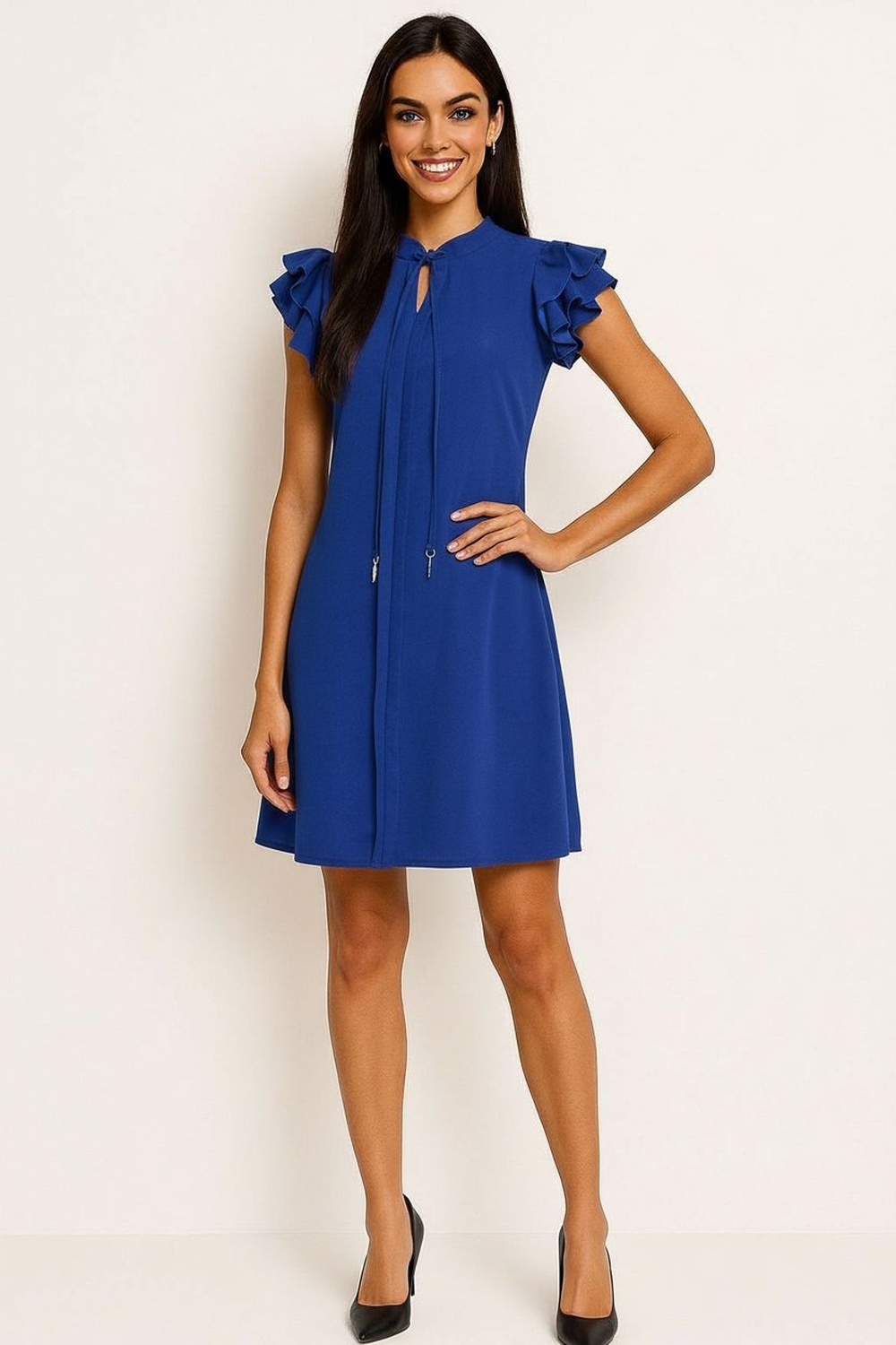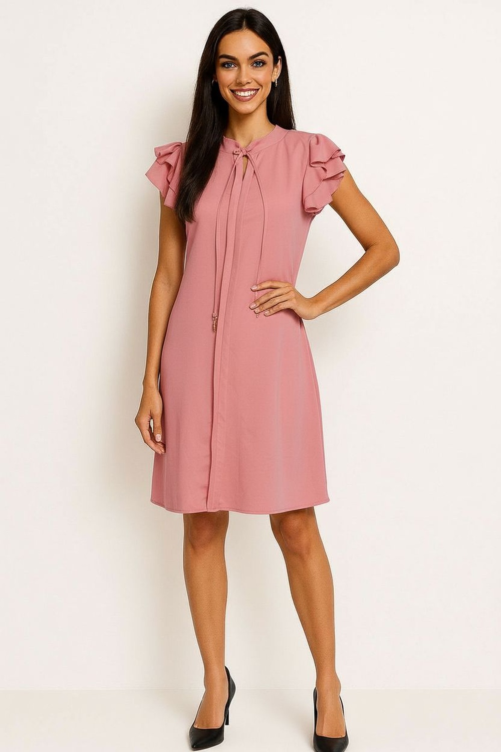 Vestido corto de corte recto con caída ligera, cuello redondo con abertura frontal y lazo decorativo ajustable, manga corta con olan en hombros que aporta volumen sutil, largo arriba de rodilla que brinda comodidad, confección en tela suave de textura ligera que favorece frescura durante el día