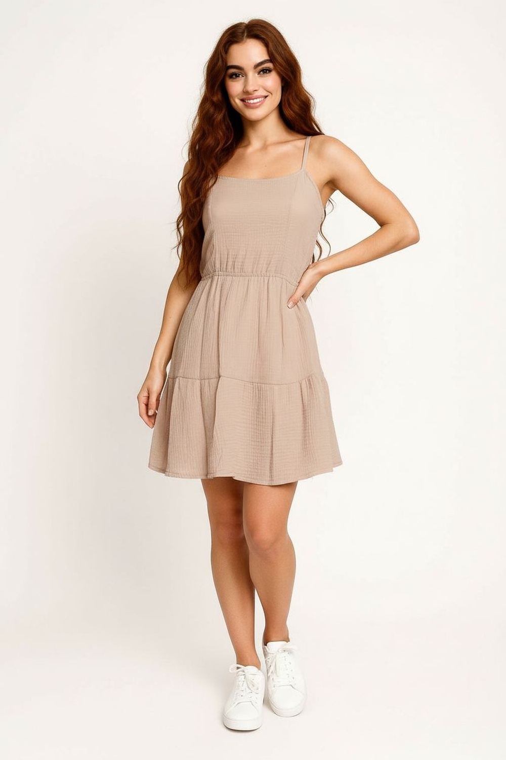 Vestido corto con escote recto y tirantes anchos con terminación elástica, cuerpo superior con panel smock que brinda ajuste flexible y estructura definida, cintura marcada que aporta balance al diseño, falda de caída ligera con largo arriba de la rodilla y movimiento natural, acabado inferior con borde suave que mantiene una silueta fluida