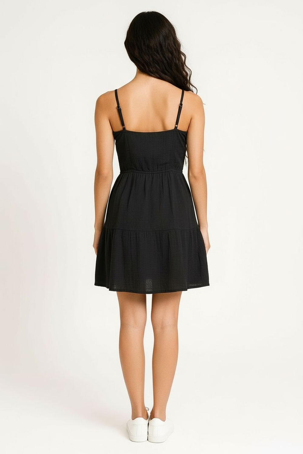 Vestido corto de tirantes delgados con escote recto, cuerpo superior con aplicación texturizada, falda de caída fluida, estructura ligera que brinda comodidad y libertad de movimiento