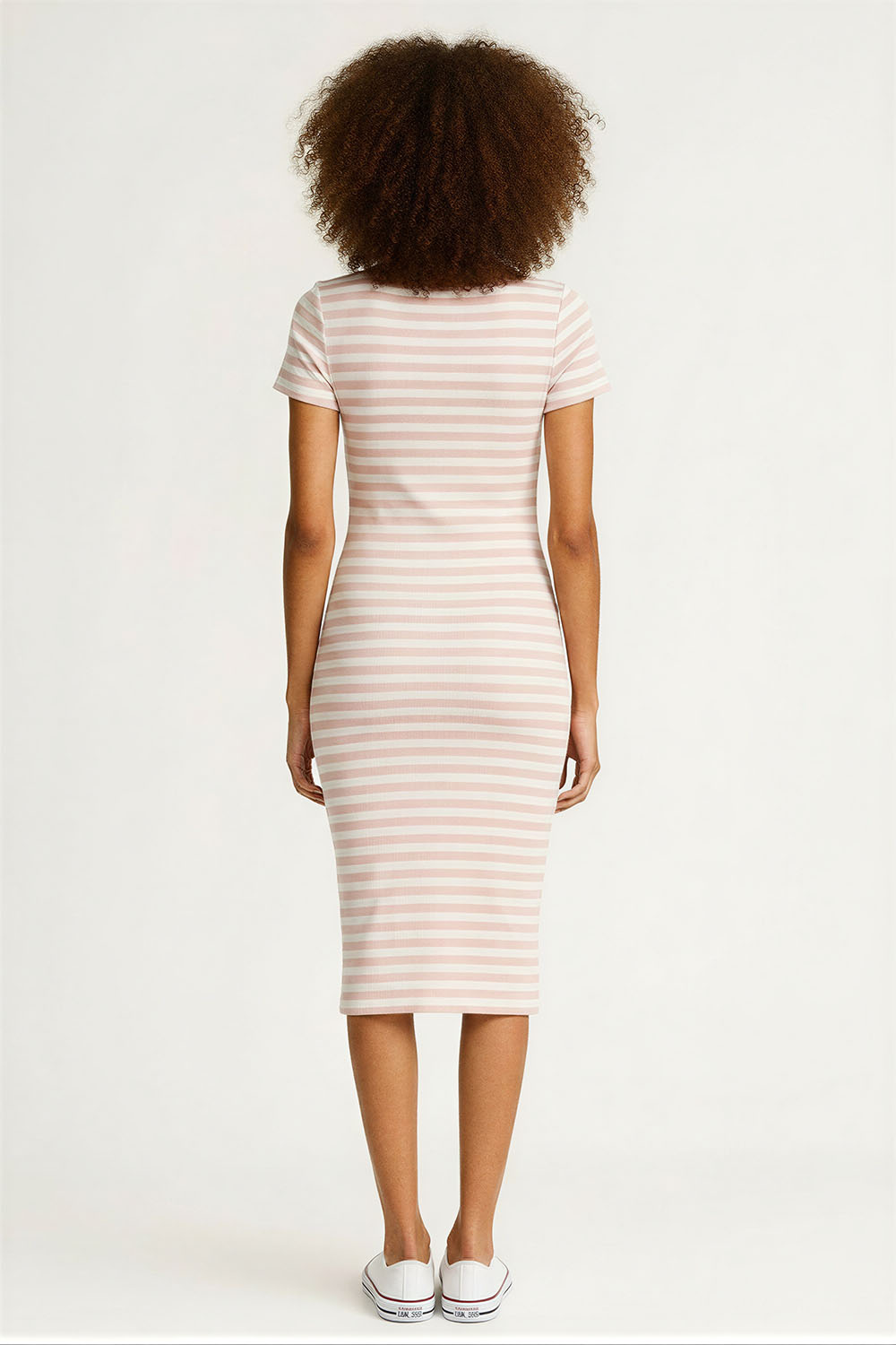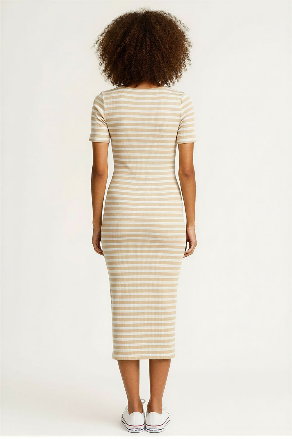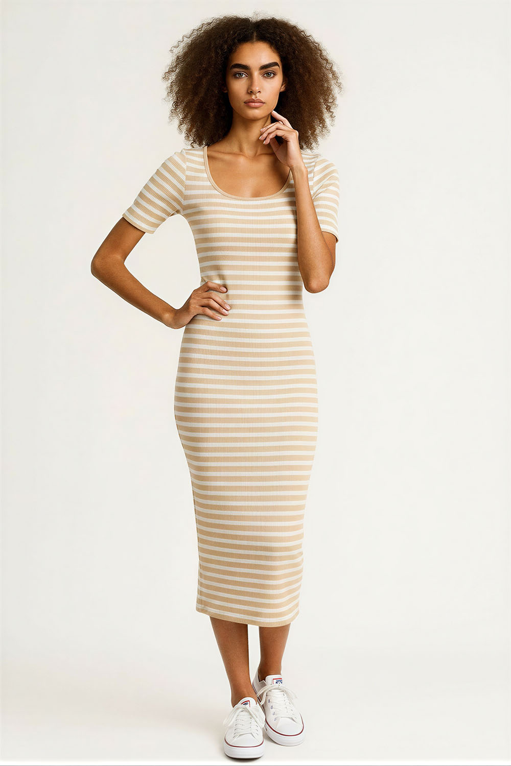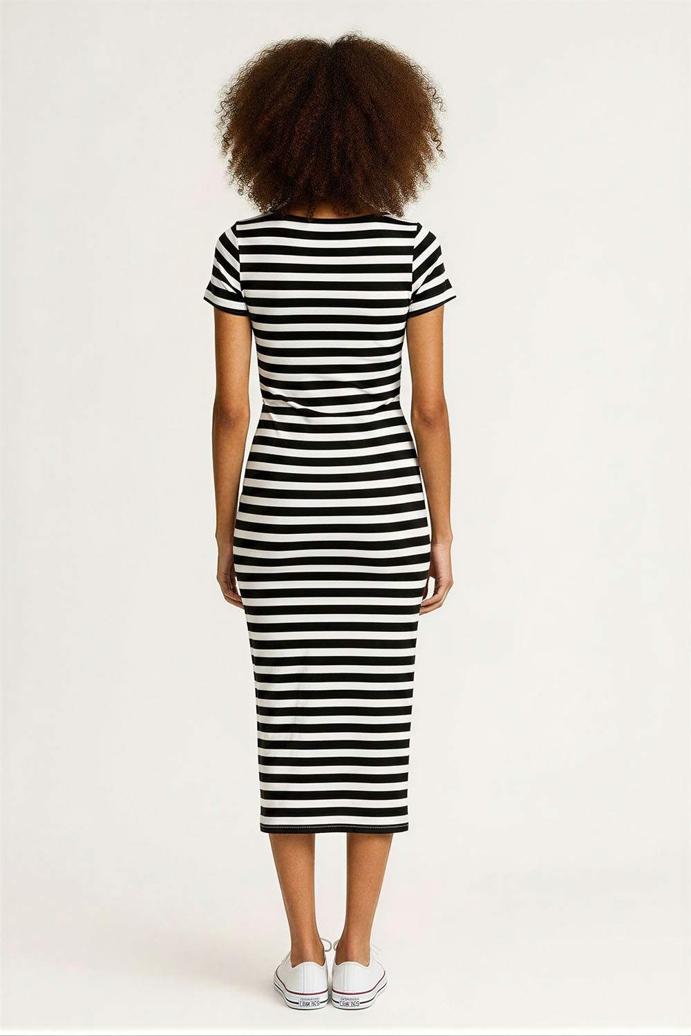 Vestido midi de silueta ajustada con corte que define la figura, escote redondo amplio que brinda comodidad al uso diario, manga corta que favorece la movilidad, largo por debajo de la rodilla con abertura lateral que aporta libertad al caminar, confección en tejido elástico que se adapta al cuerpo y brinda ajuste cómodo