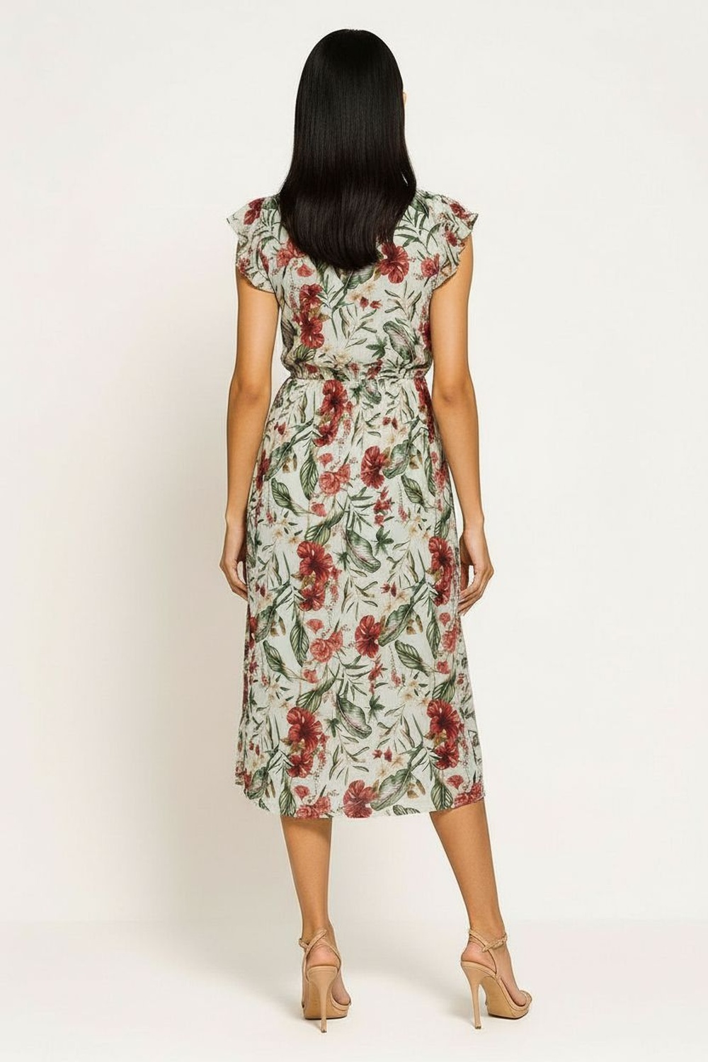 Vestido midi de manga corta con escote en V que estiliza el torso, botonadura frontal funcional que facilita el ajuste, corte recto con caída ligera que aporta comodidad, largo debajo de la rodilla que brinda equilibrio visual, confección en tela suave y fresca para uso continuo