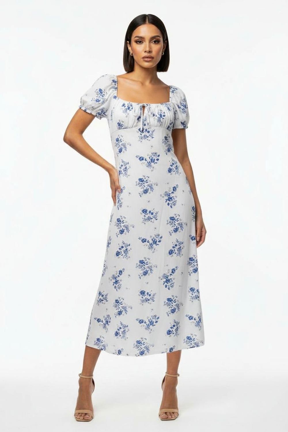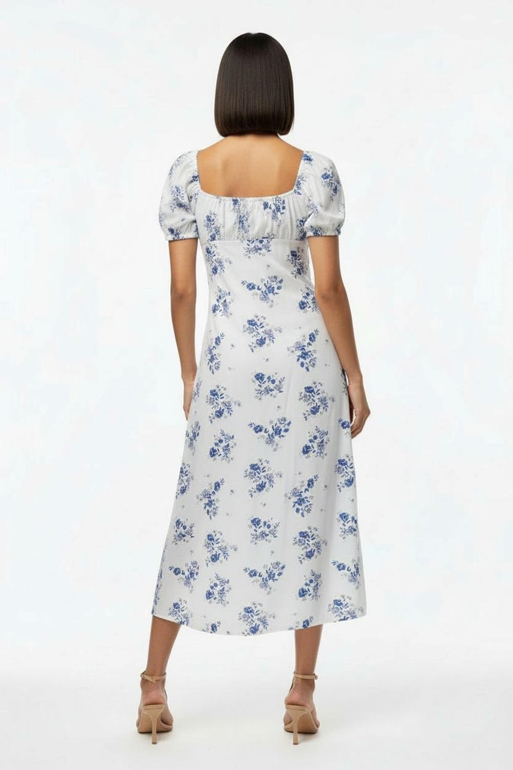 Vestido corto con escote en pico, manga corta con volumen, cintura definida, falda con ligero vuelo, acabado en orillas suaves, silueta fluida