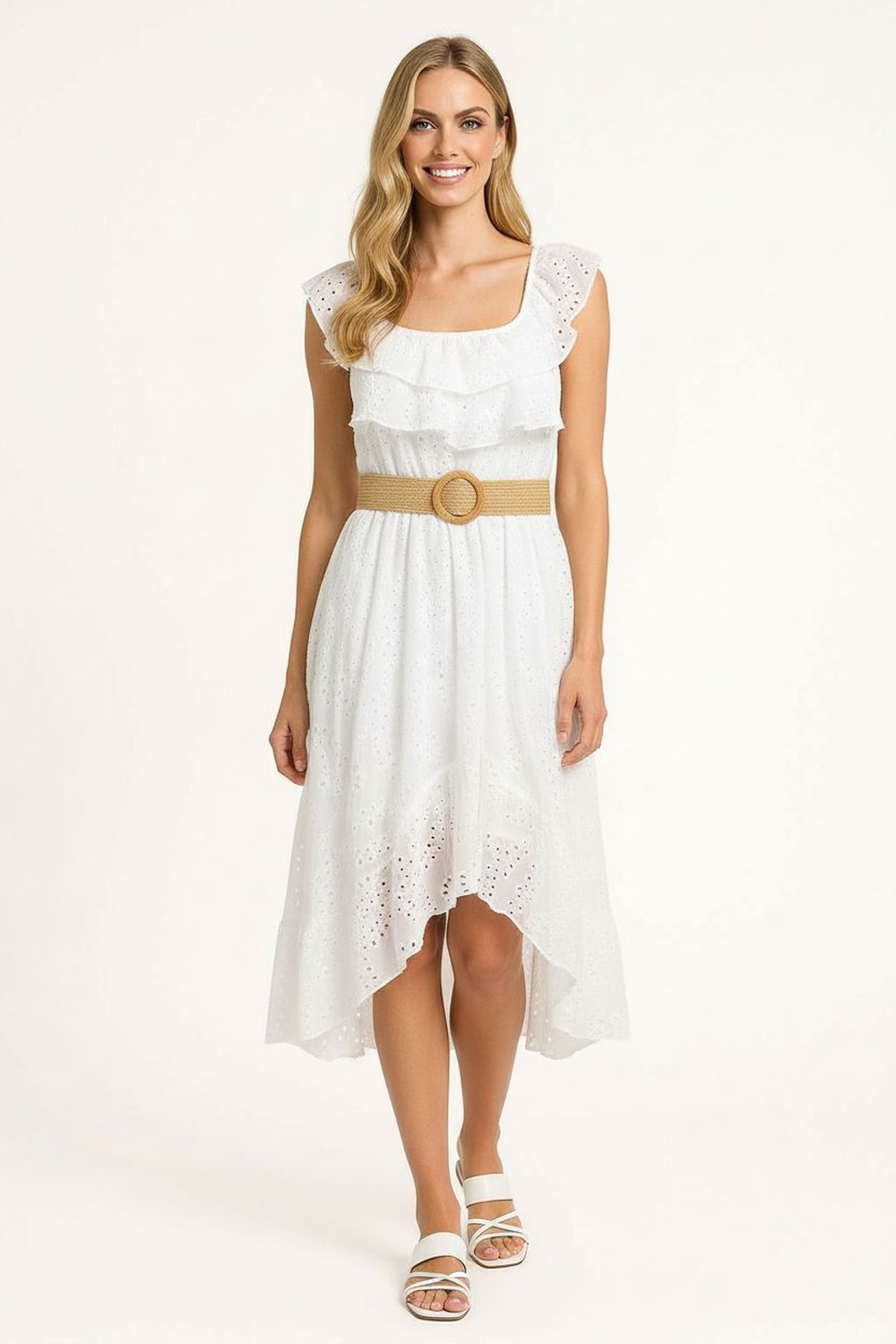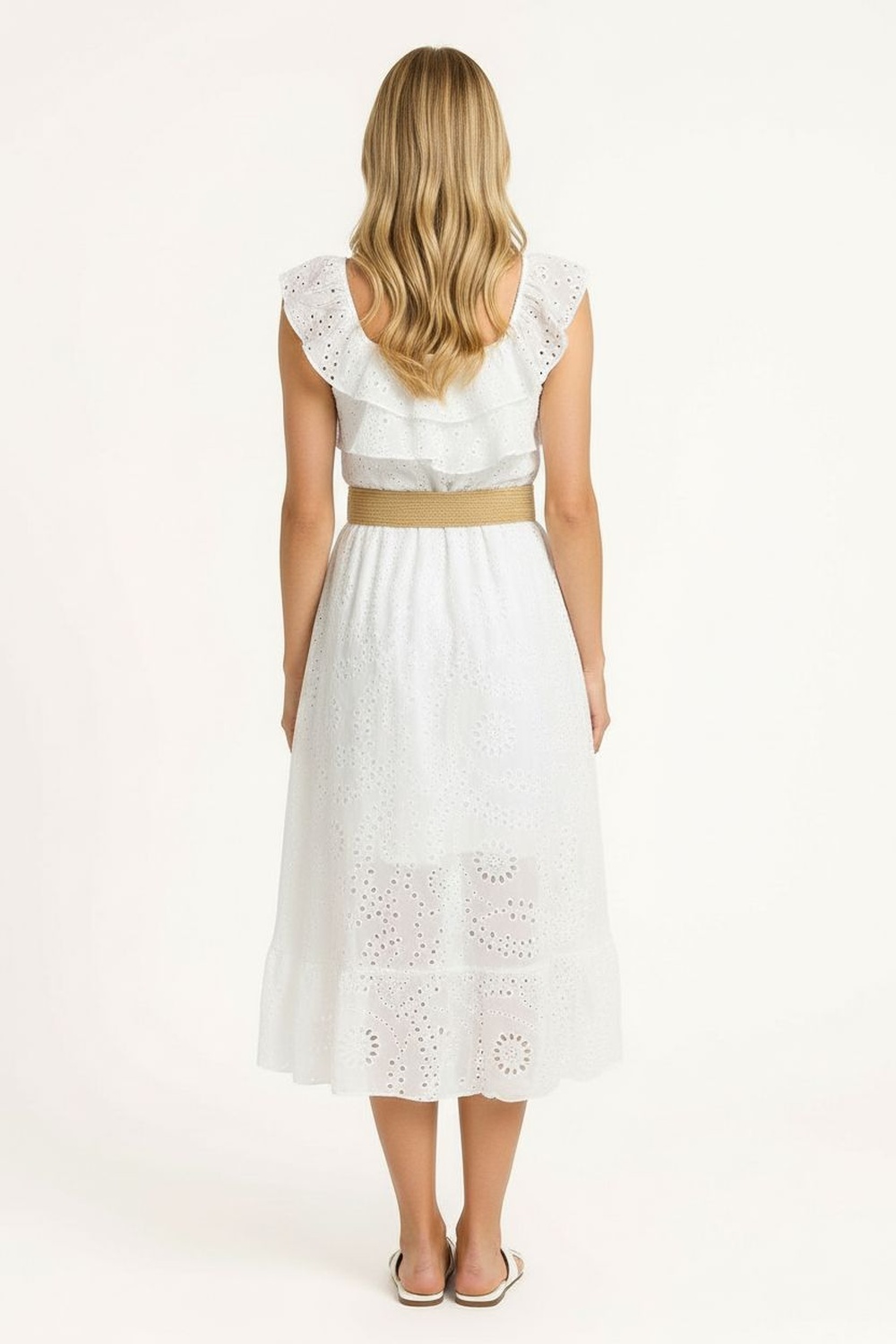 Vestido de escote descubierto con olan continuo en la parte superior que aporta movimiento, largo midi con caída asimétrica que estiliza la silueta, cintura definida mediante accesorio desmontable que permite ajuste, confección en tejido ligero con textura suave y fresca