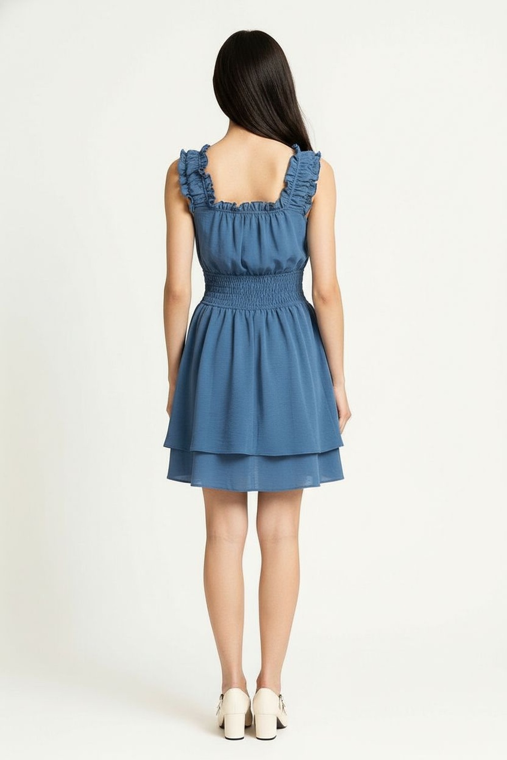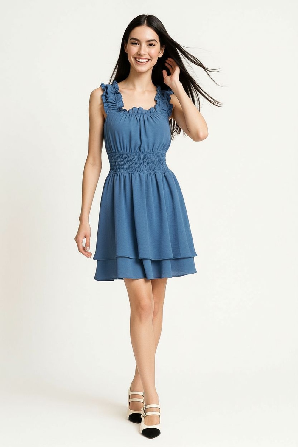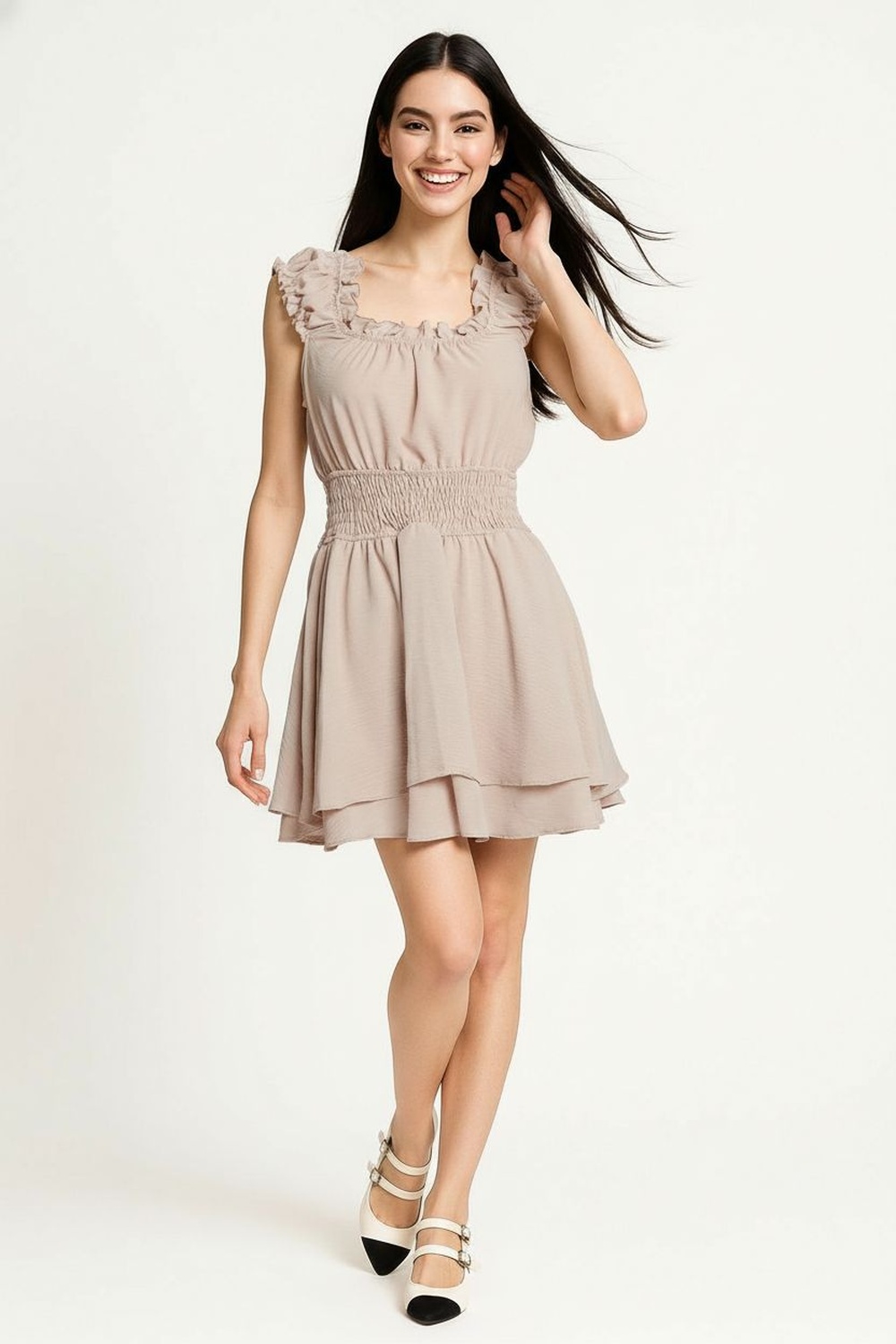 Vestido corto con escote cuadrado y detalle fruncido que realza la parte superior, pretina elástica que define la cintura, falda con doble capa que añade volumen y movimiento, tejido ligero con caída natural que ofrece frescura y confort
