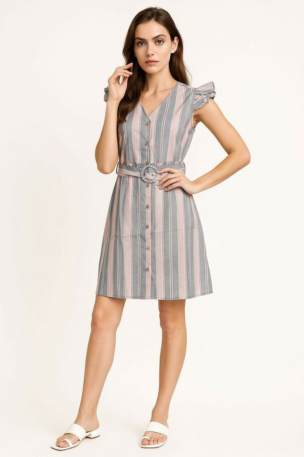 Vestido corto sin mangas con escote en V, botonadura frontal funcional, cinturón integrado para ajuste al torso, falda recta con caída ligera y estructura cómoda para uso continuo