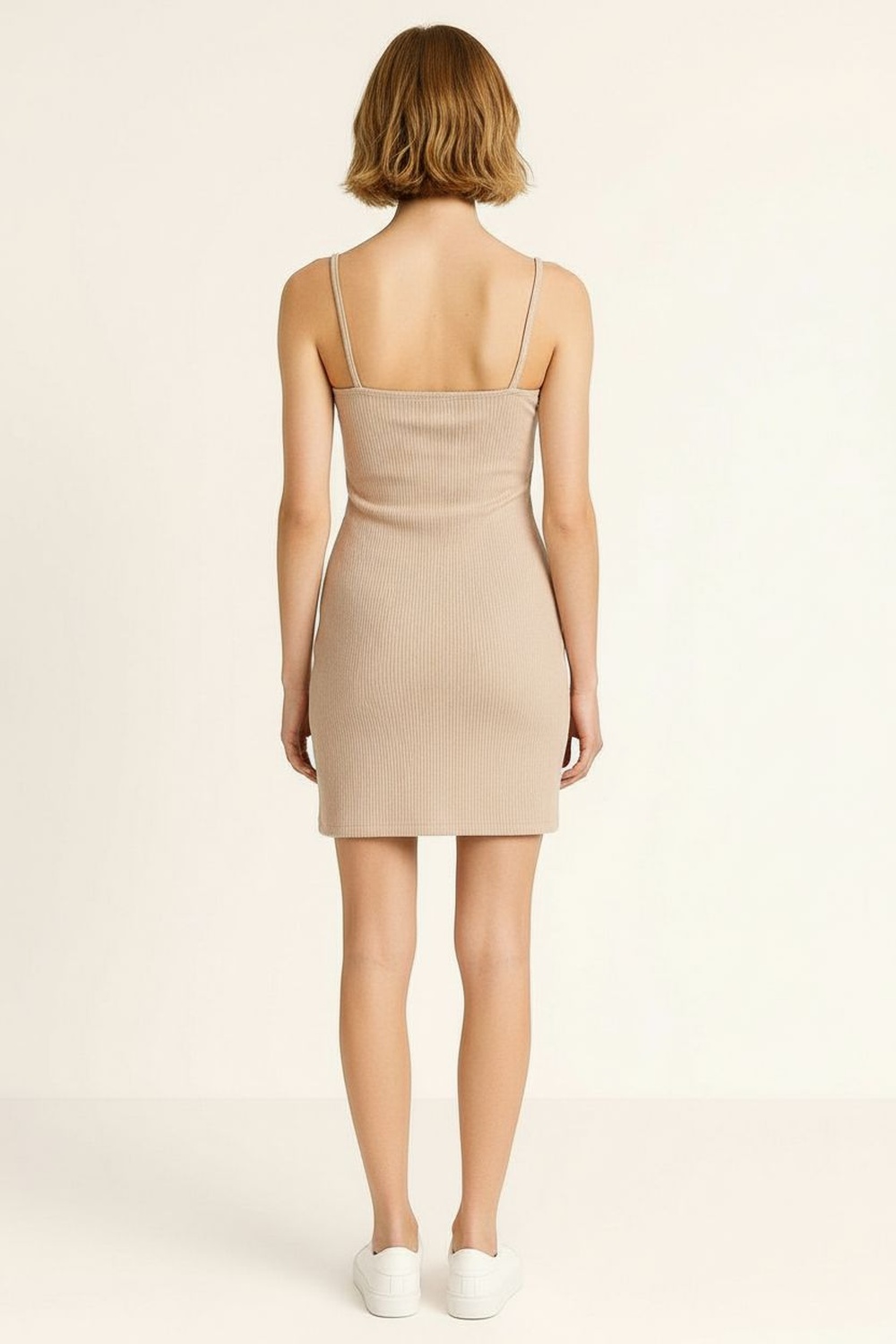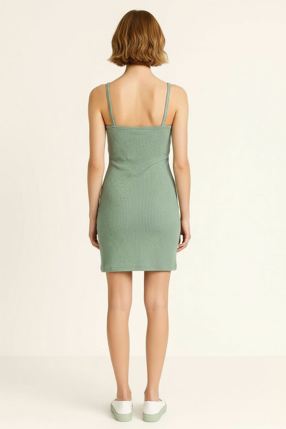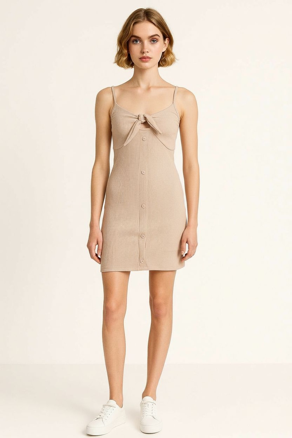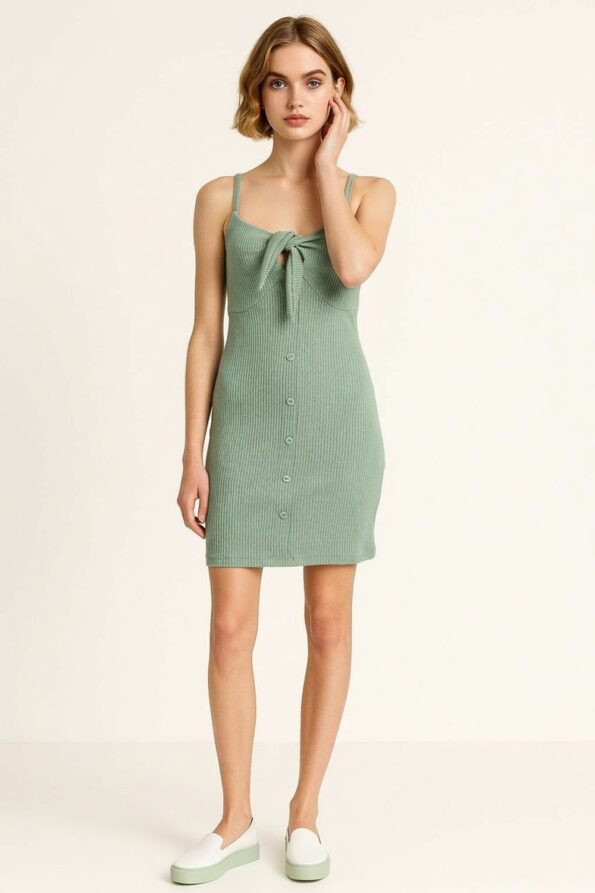 Vestido corto confeccionado en tejido rib con tirantes delgados que realzan los hombros, escote con detalle de amarre al frente que aporta un toque femenino y favorecedor, corte ajustado que estiliza la silueta, botones decorativos frontales que añaden un acabado moderno, confección en tela elástica y suave que asegura comodidad y libertad de movimiento