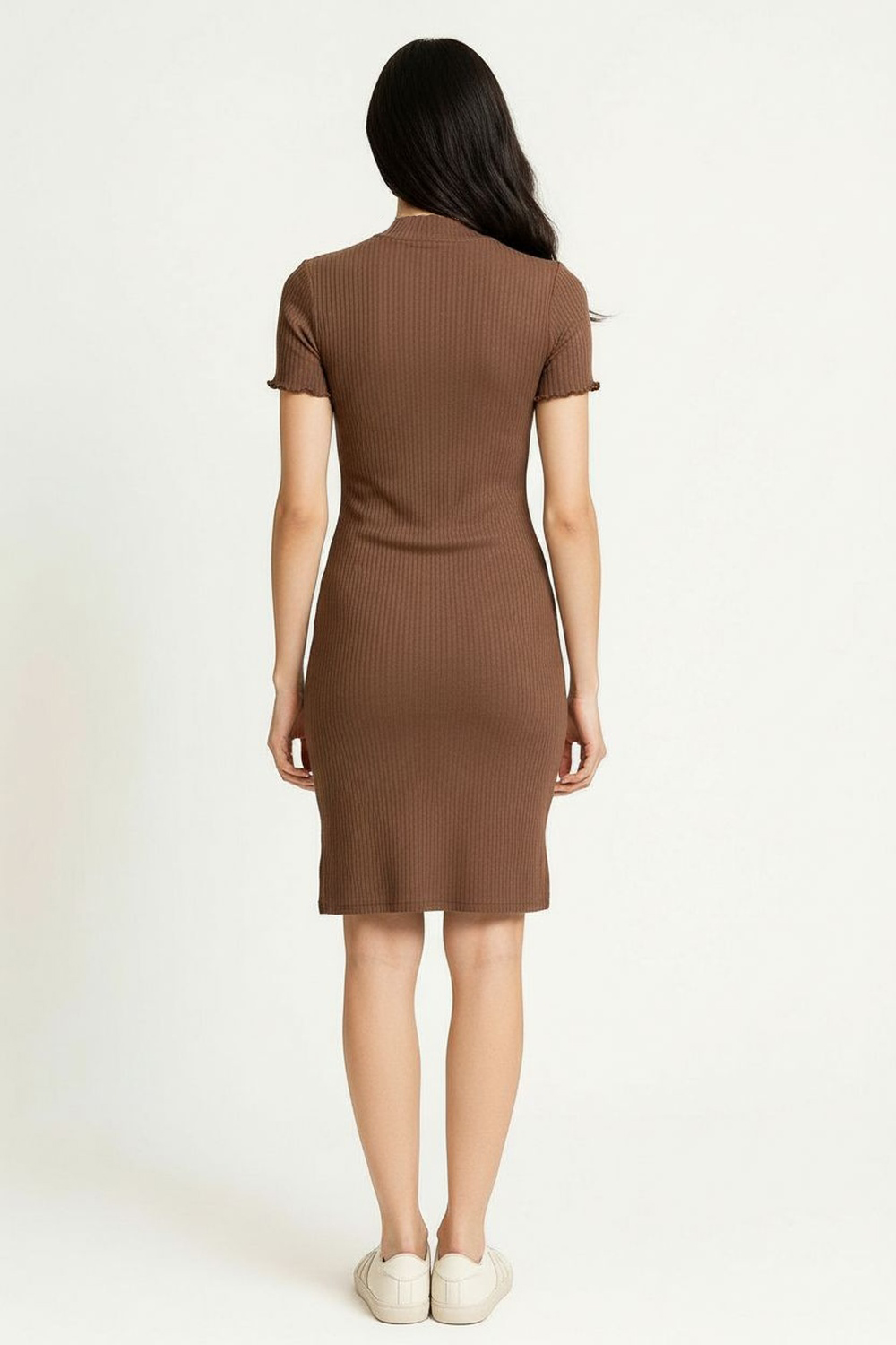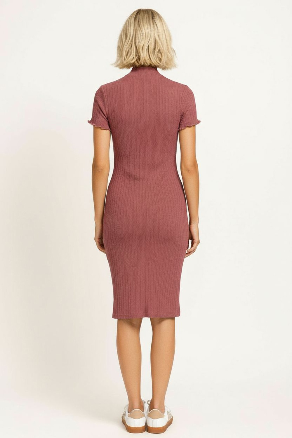 Vestido confeccionado en tejido acanalado con textura que se adapta al cuerpo, cuello alto que aporta un toque elegante, manga corta y corte entallado que define la silueta, terminado con orillas suaves que garantizan confort durante el uso