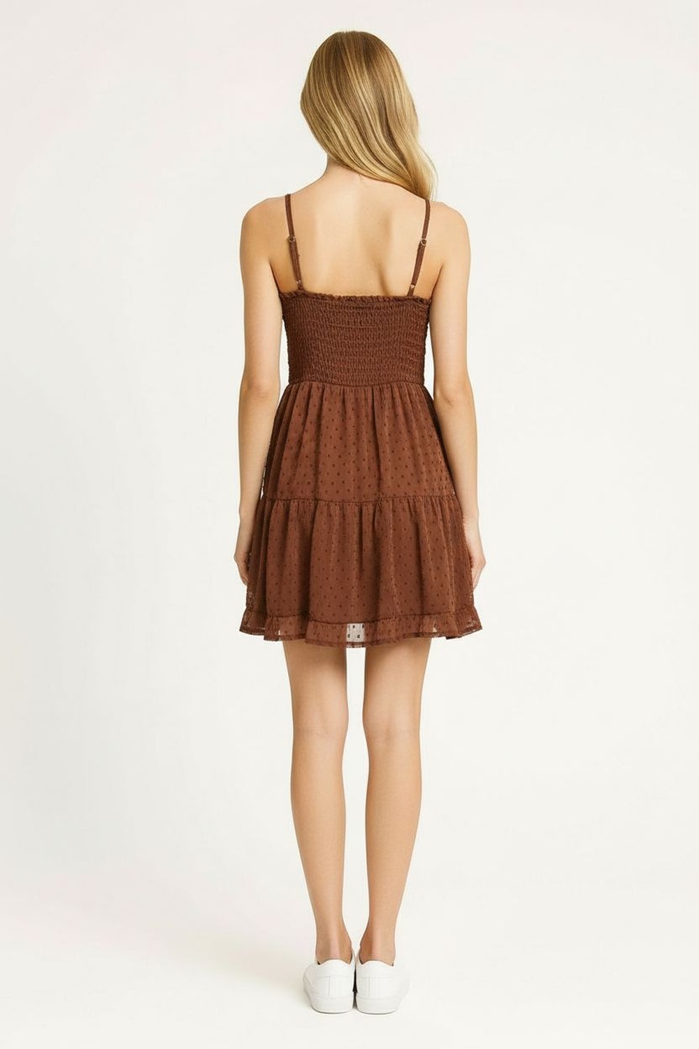 Vestido de tirantes con cuerpo ajustado en la parte superior, falda amplia con caída ligera, textura delicada que aporta detalle visual, confección ligera que permite movimiento fluido y silueta cómoda
