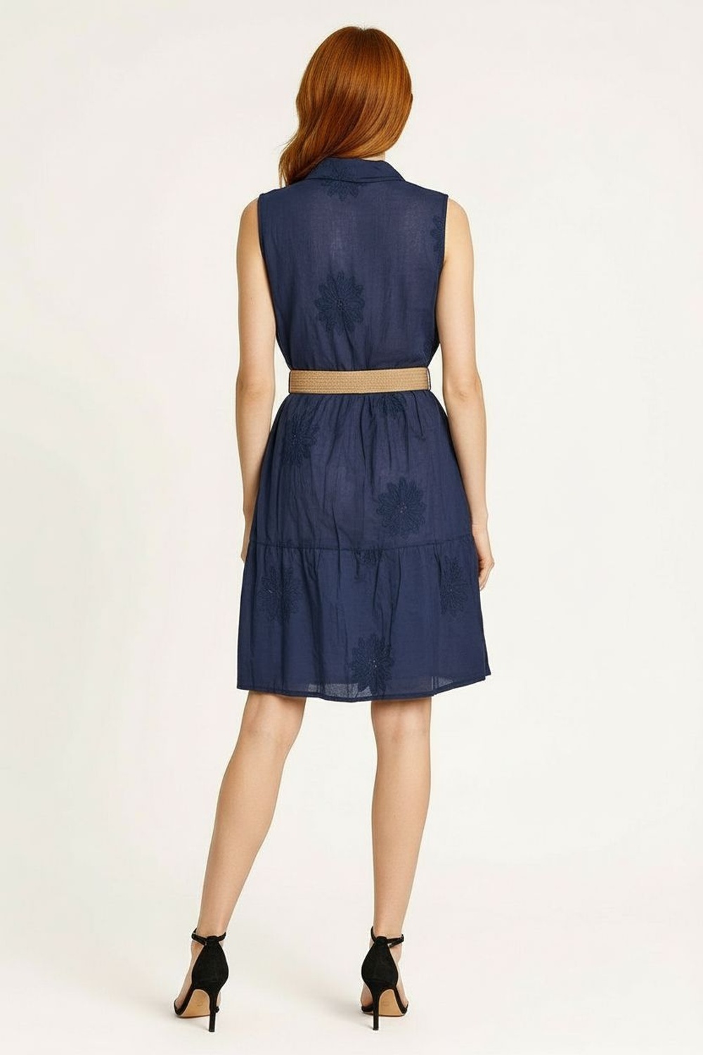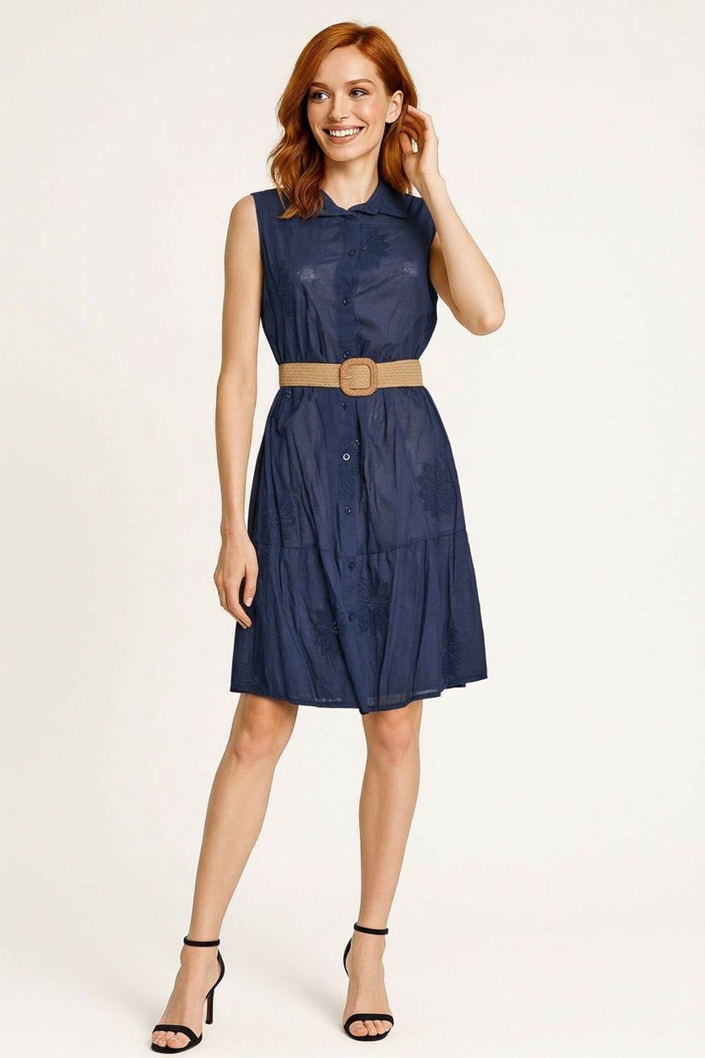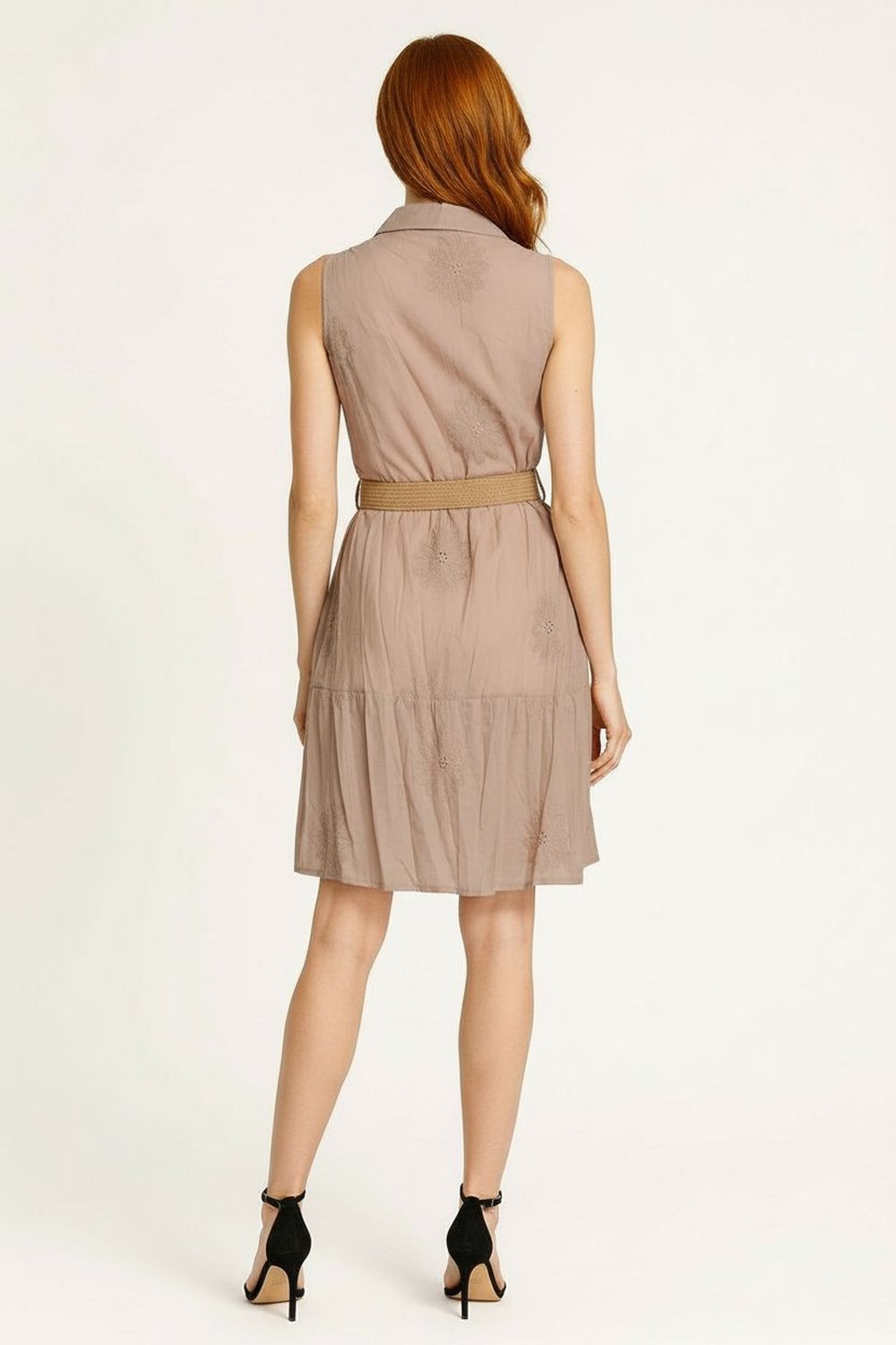 Vestido sin manga con cuello camisero, botonadura frontal, cinturón integrado, ajuste en cintura, corte corto, confección ligera