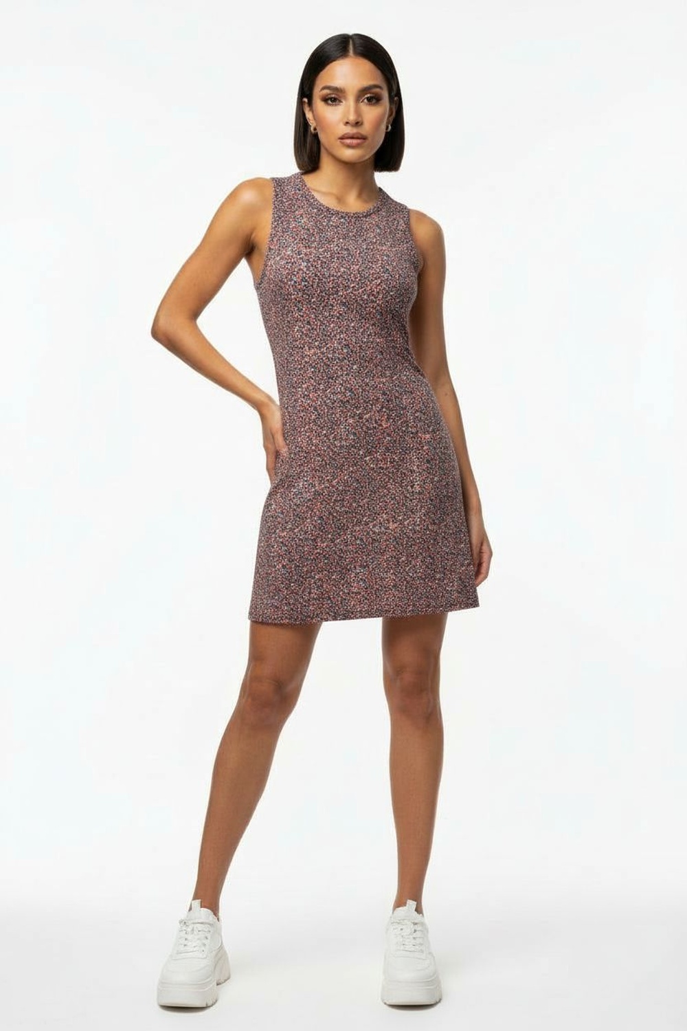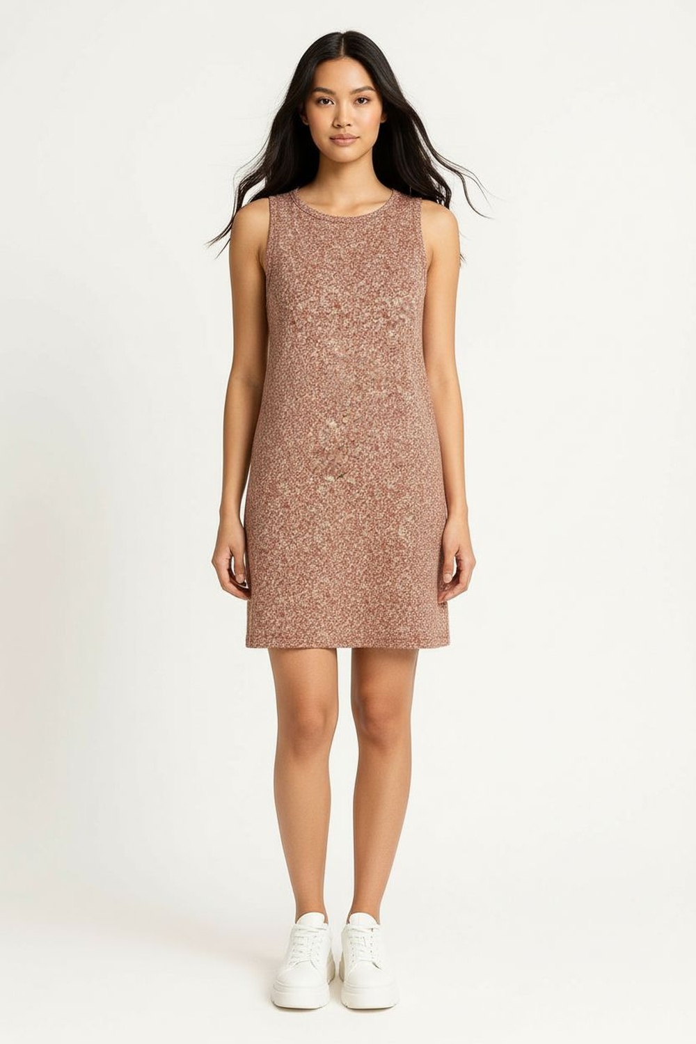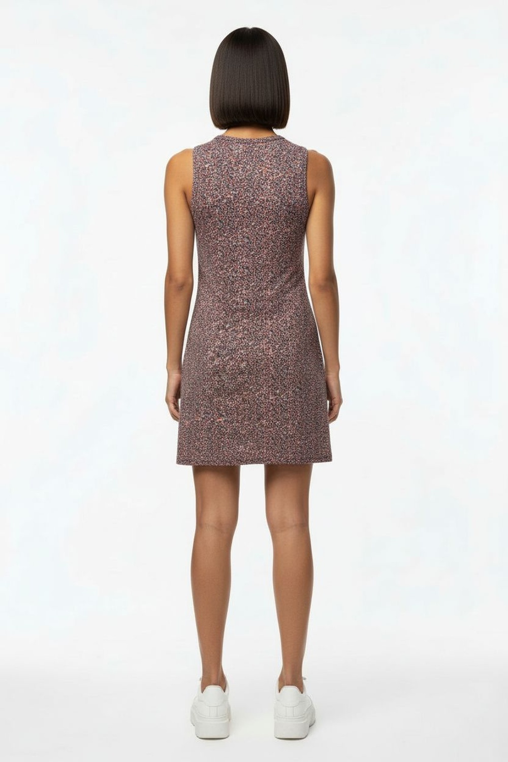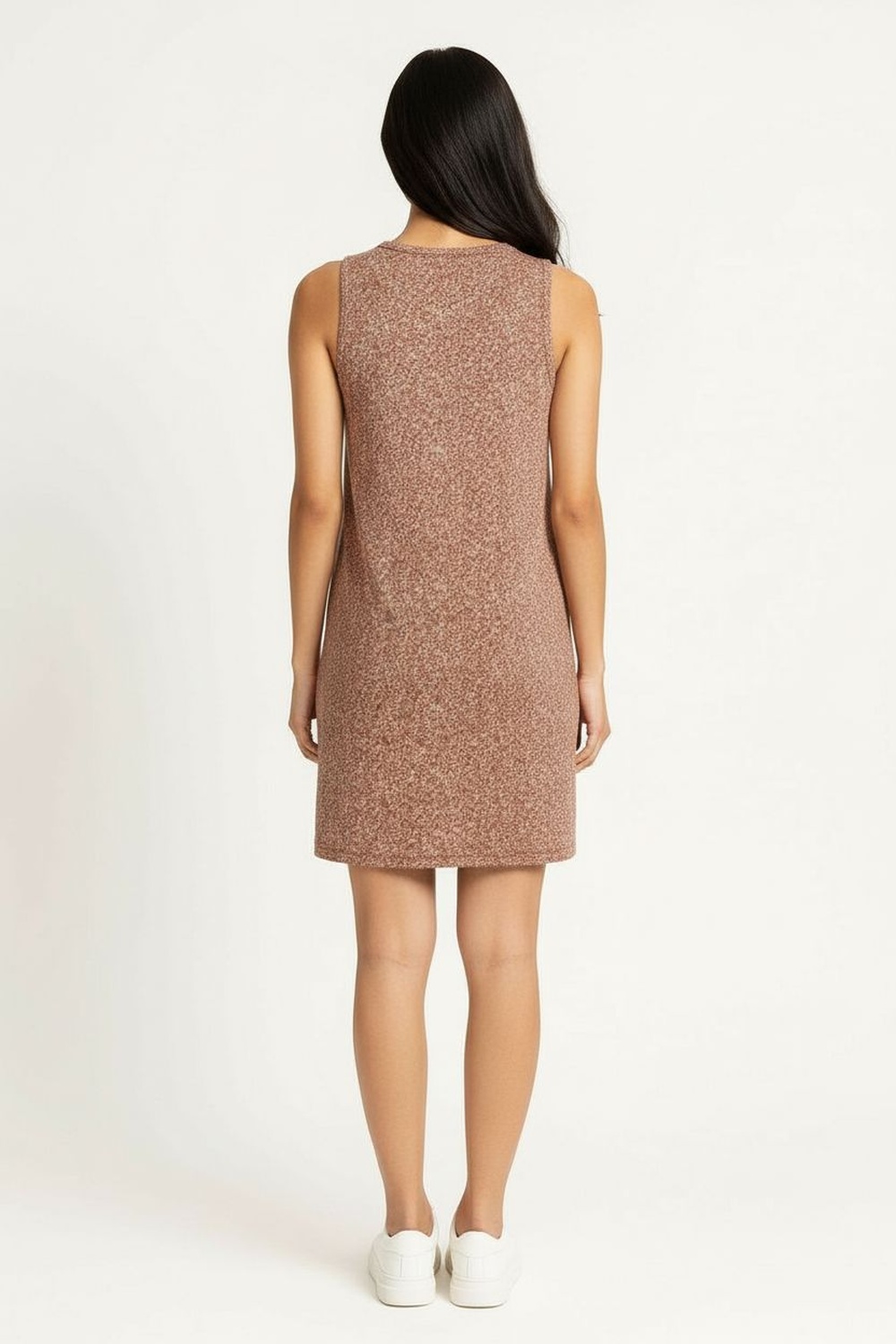 Vestido sin manga con corte recto y largo arriba de rodilla, ajuste cómodo que se adapta al cuerpo, tela ligera con buena caída, terminados limpios para uso diario