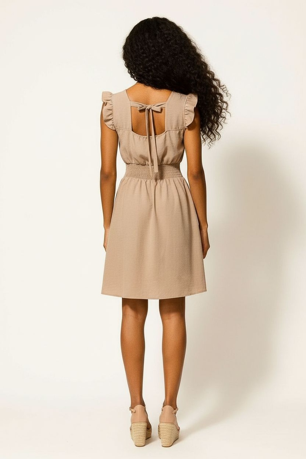 Vestido corto con escote cuadrado que realza la parte superior, cuerpo con fruncido elástico que se adapta al contorno, manga corta con volumen estructurado que aporta balance, falda con caída fluida y largo arriba de la rodilla, confección ligera que brinda comodidad continua