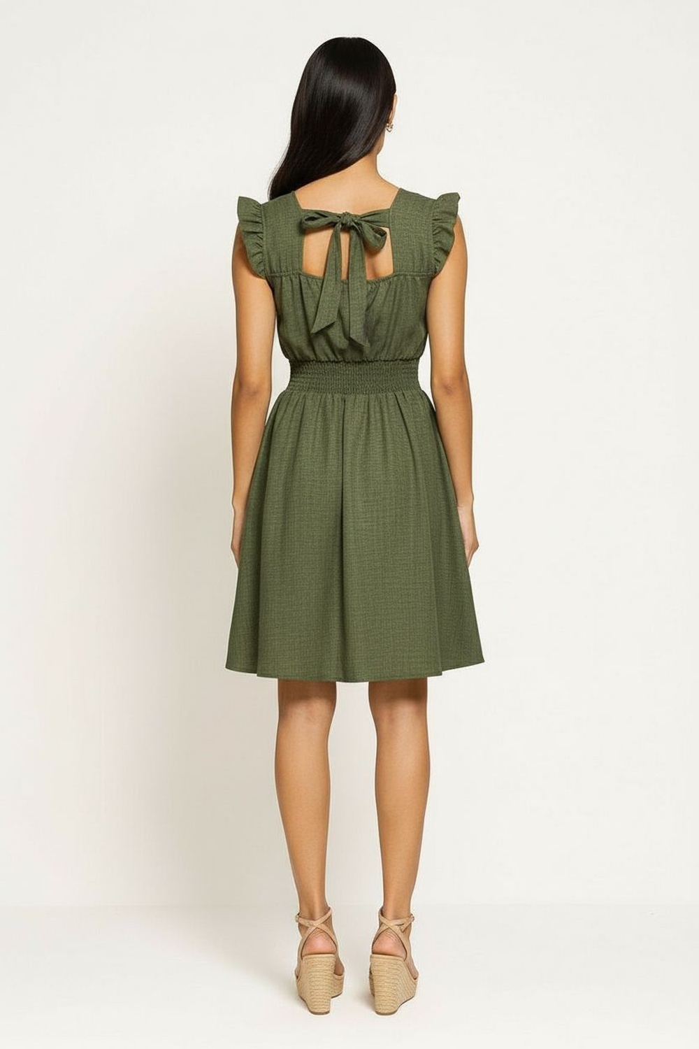 Vestido midi de tirantes con escote delicado y estructura definida en la parte superior, cintura con panel elástico que se adapta al contorno y realza la figura, falda con caída amplia que aporta movimiento natural, diseño con forro interno que brinda mayor cobertura y seguridad, detalle posterior con abertura y lazo que añade ajuste personalizado