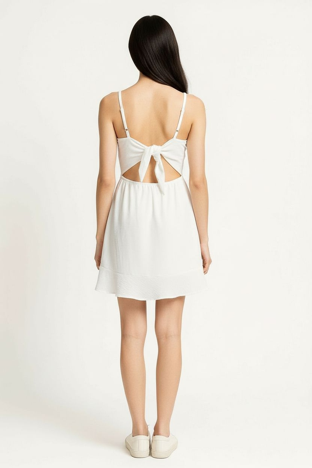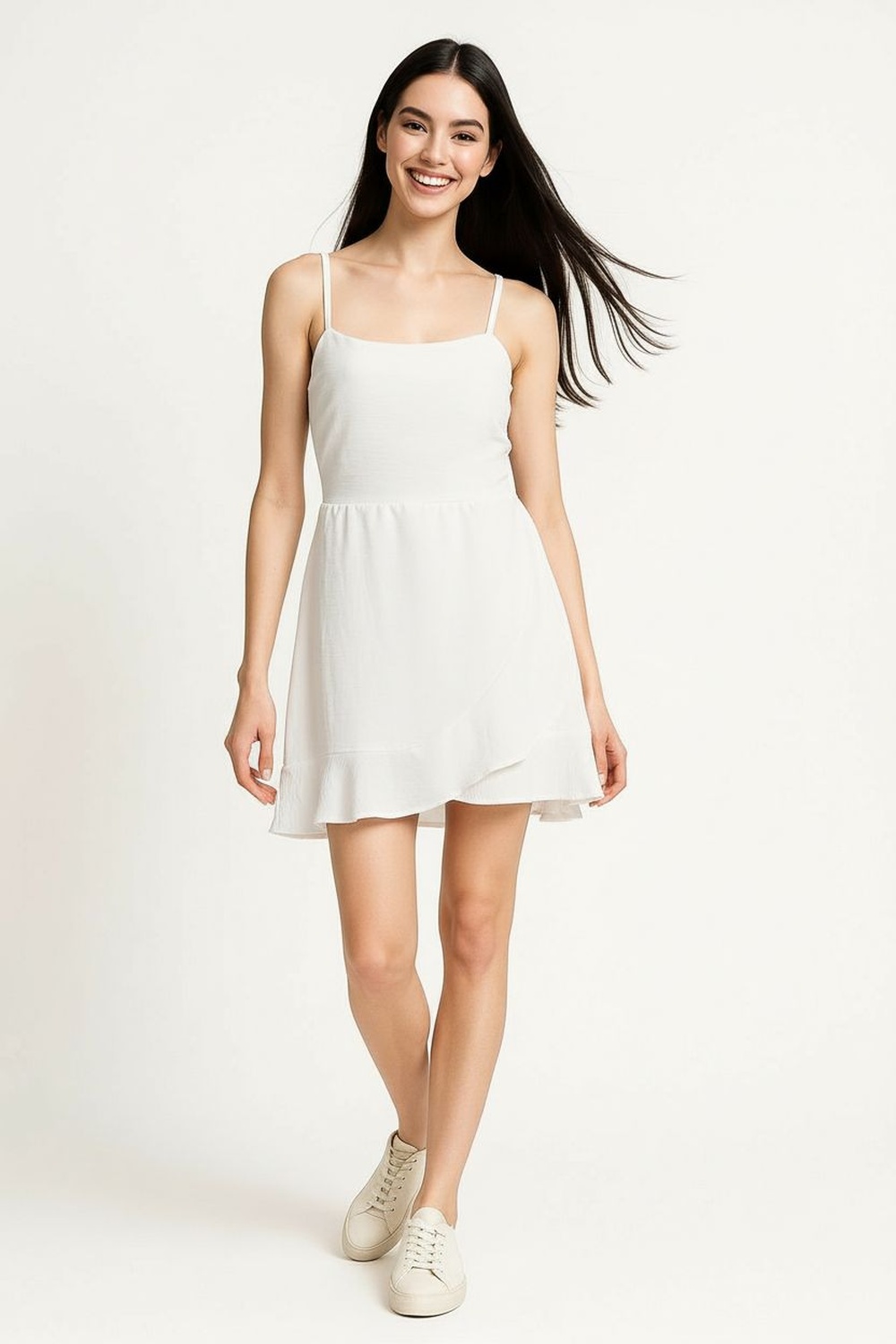 Vestido corto de tirantes delgados con escote recto que brinda soporte, cintura elástica que define la silueta, falda con ligero vuelo que aporta movimiento, largo arriba de la rodilla para mayor frescura, confección en tejido ligero con caída natural