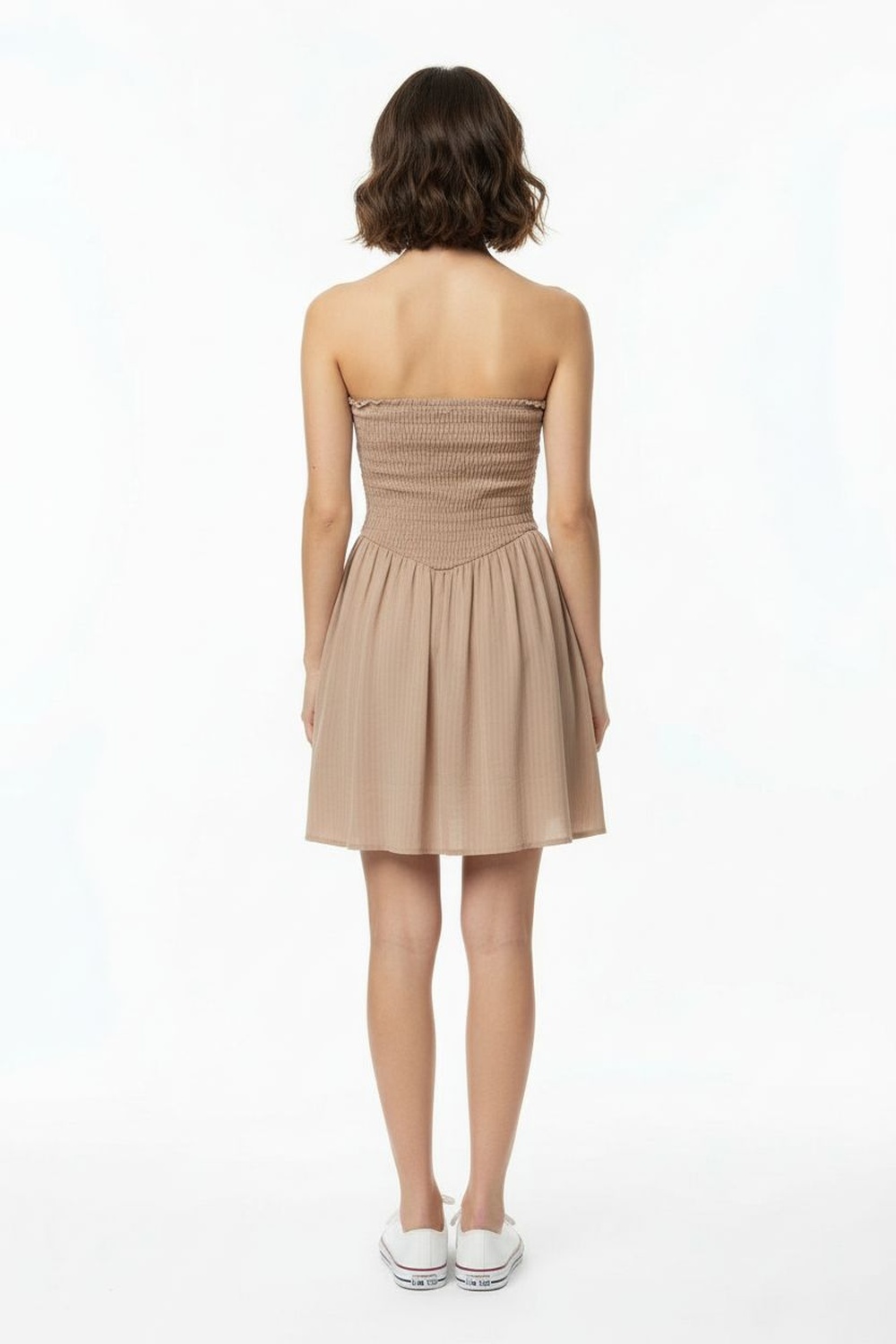 Vestido strapless con panel superior de smock, corte en cintura, falda con caída amplia, estructura ligera y ajuste cómodo en la parte superior