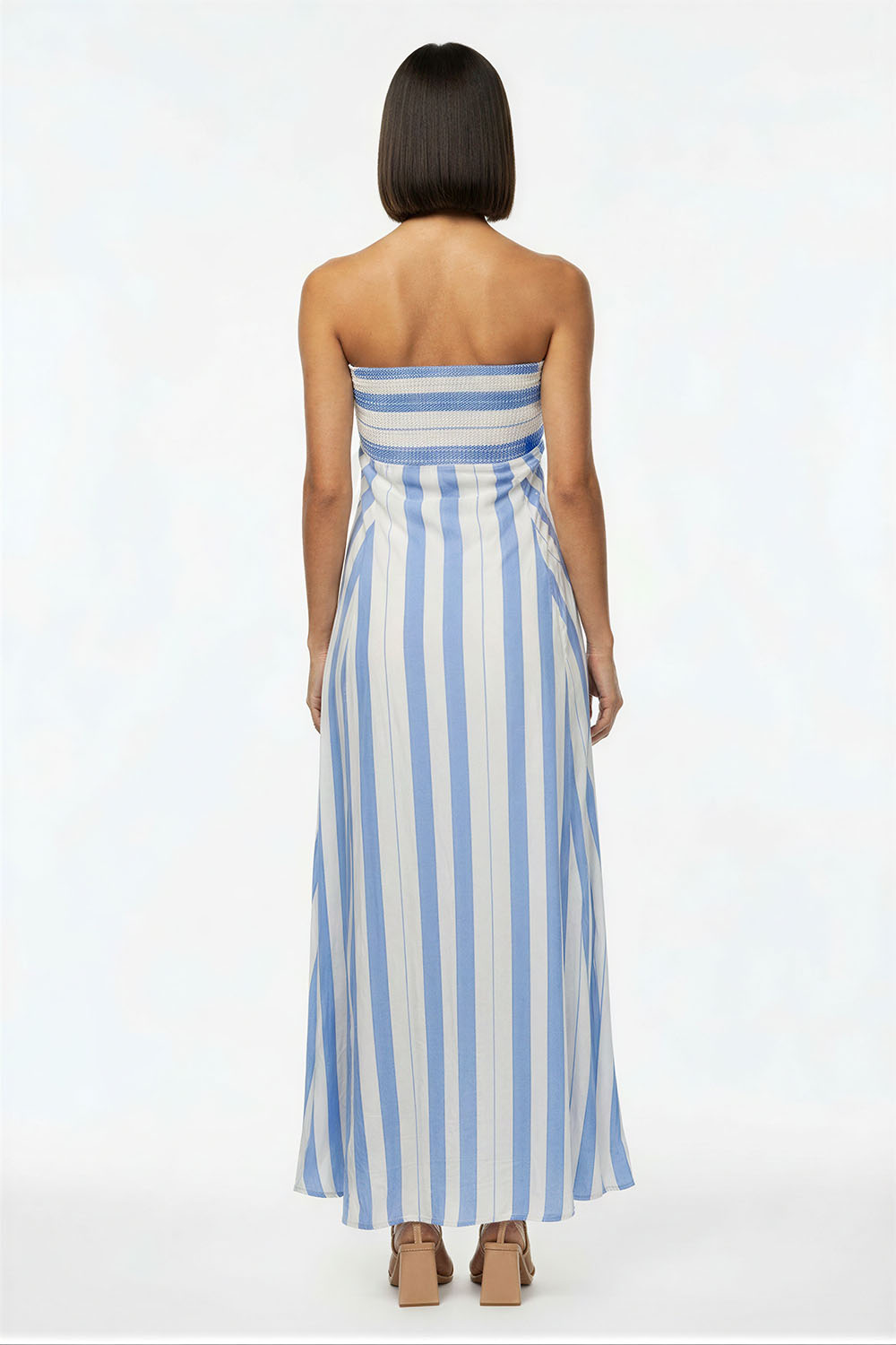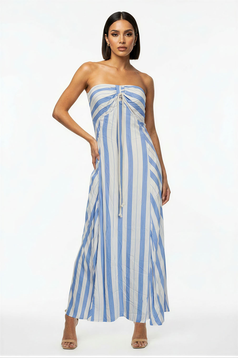 Vestido strapless con escote recto que estiliza la parte superior, corte midi con caída amplia que aporta movimiento, diseño con ajuste en busto que brinda soporte, confección en tejido ligero que favorece la frescura y comodidad