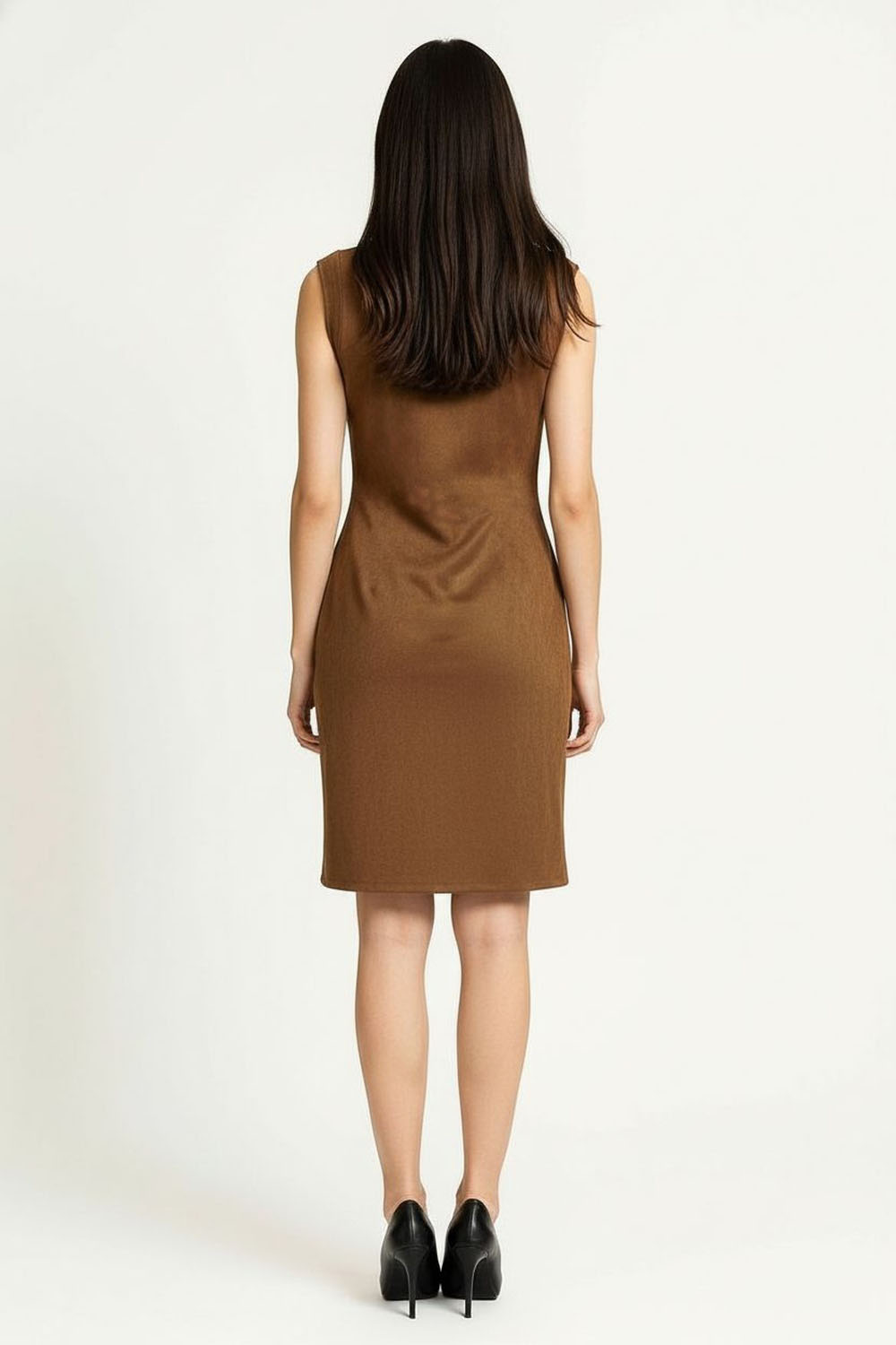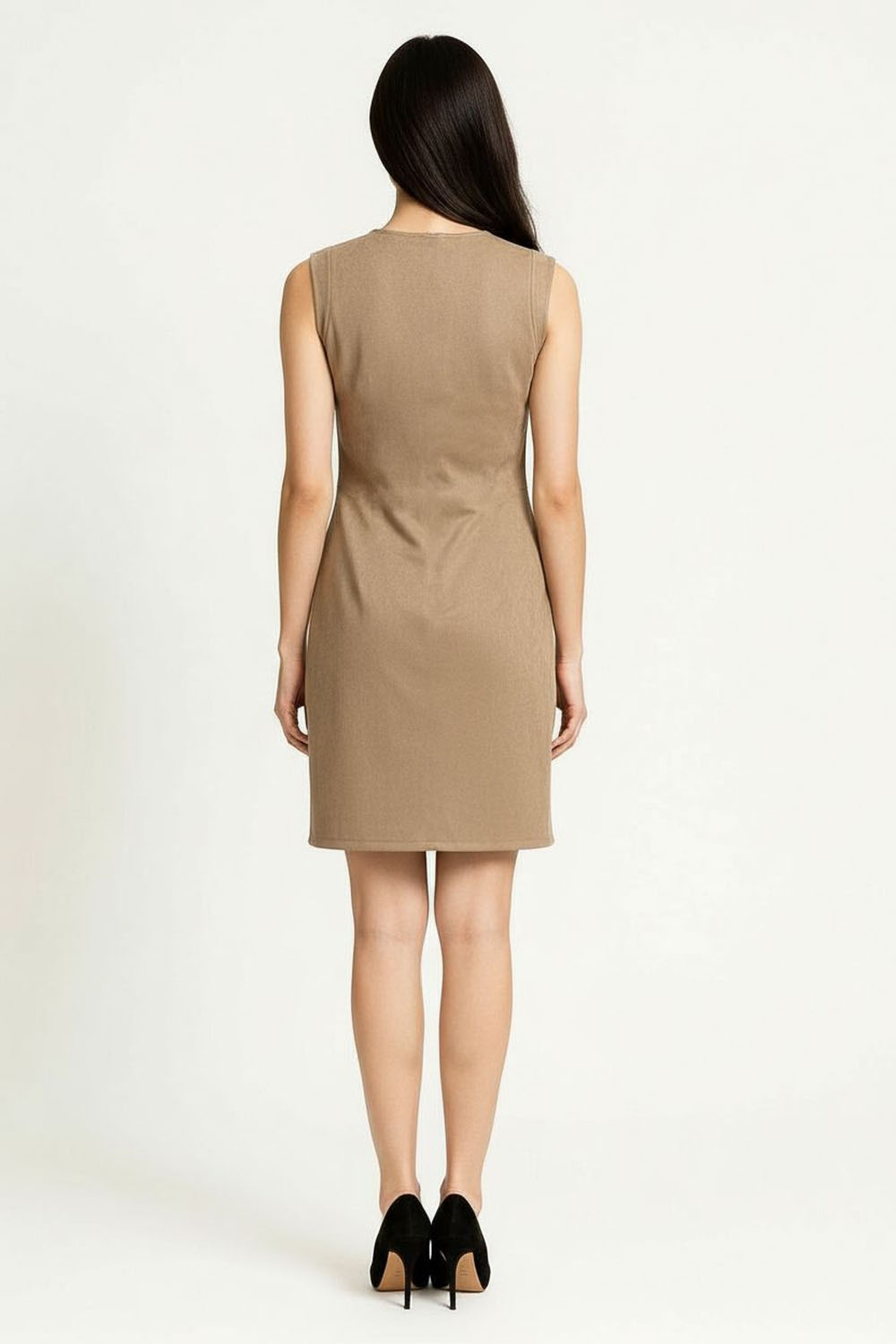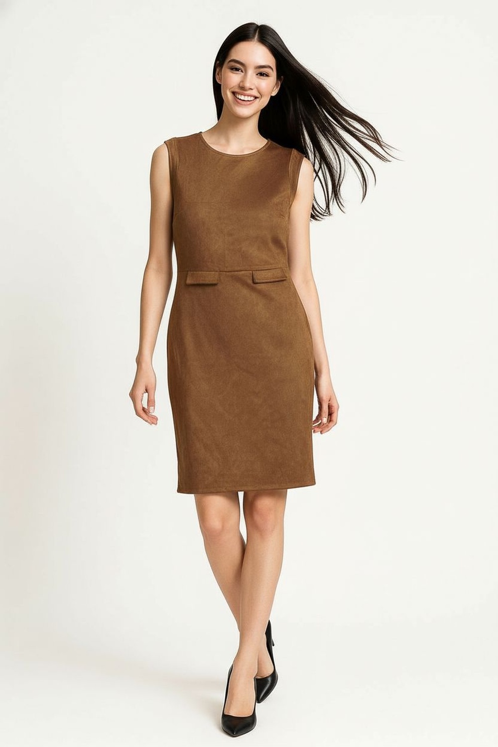 Vestido sin mangas con cuello redondo que genera línea continua, silueta recta con ajuste controlado que estiliza el torso, aplicaciones frontales tipo cartera que aportan dimensión, costuras planas que mantienen estructura, confección en tejido tipo suede que brinda textura uniforme y tacto suave