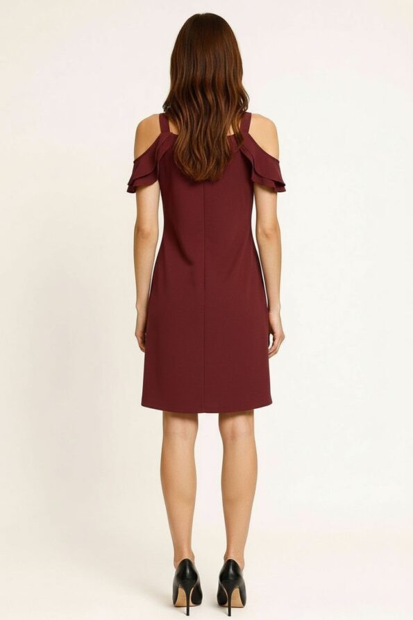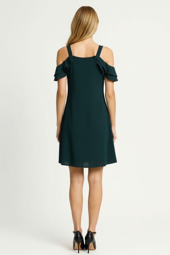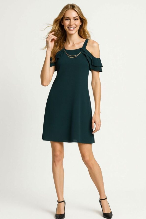 Vestido suelto con tirantes anchos y mangas descubiertas que aportan un diseño moderno, escote recto con aplicación de cadena decorativa que realza el look, silueta relajada que brinda comodidad y frescura, confeccionado en tejido ligero con caída fluida, costuras reforzadas que aseguran resistencia y durabilidad