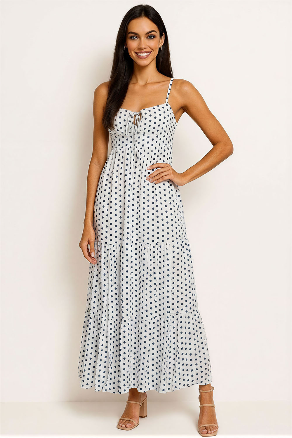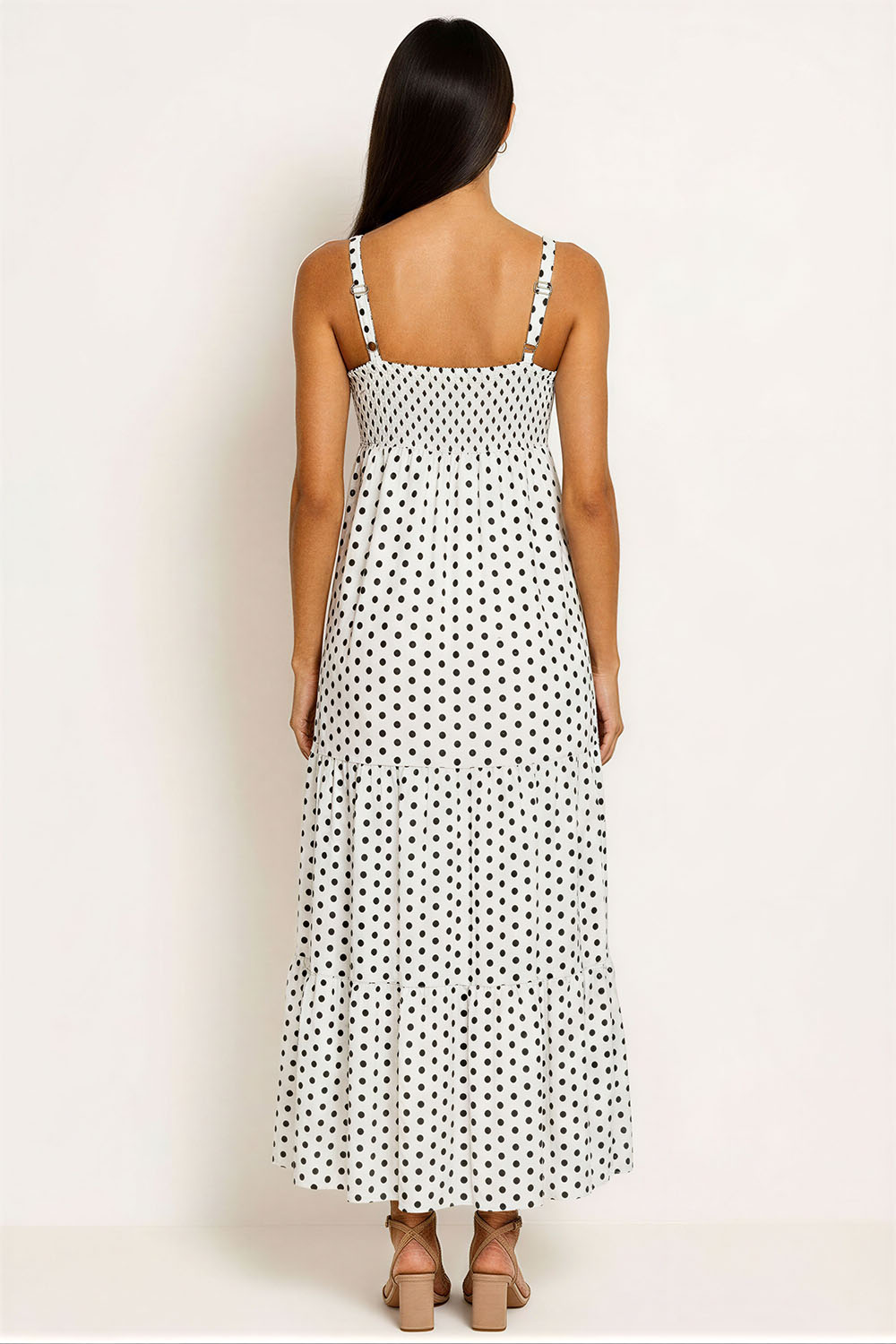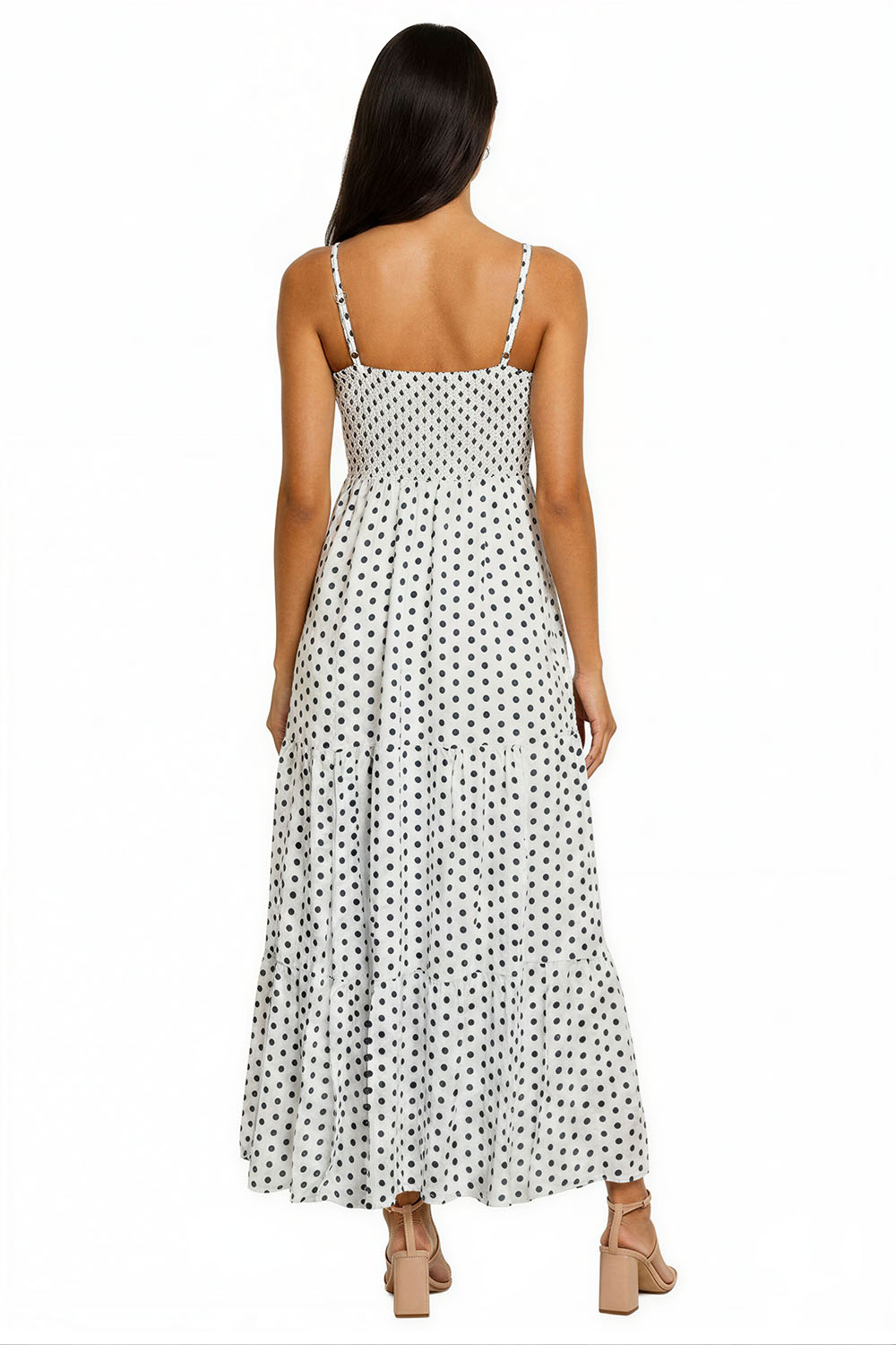 Vestido de tirantes delgados con escote recto que define la parte superior, corte a la cintura que estiliza la silueta, falda midi con caída ligera que aporta movimiento, confección en tela suave que brinda comodidad durante el uso, diseño versátil que se adapta a diferentes ocasiones