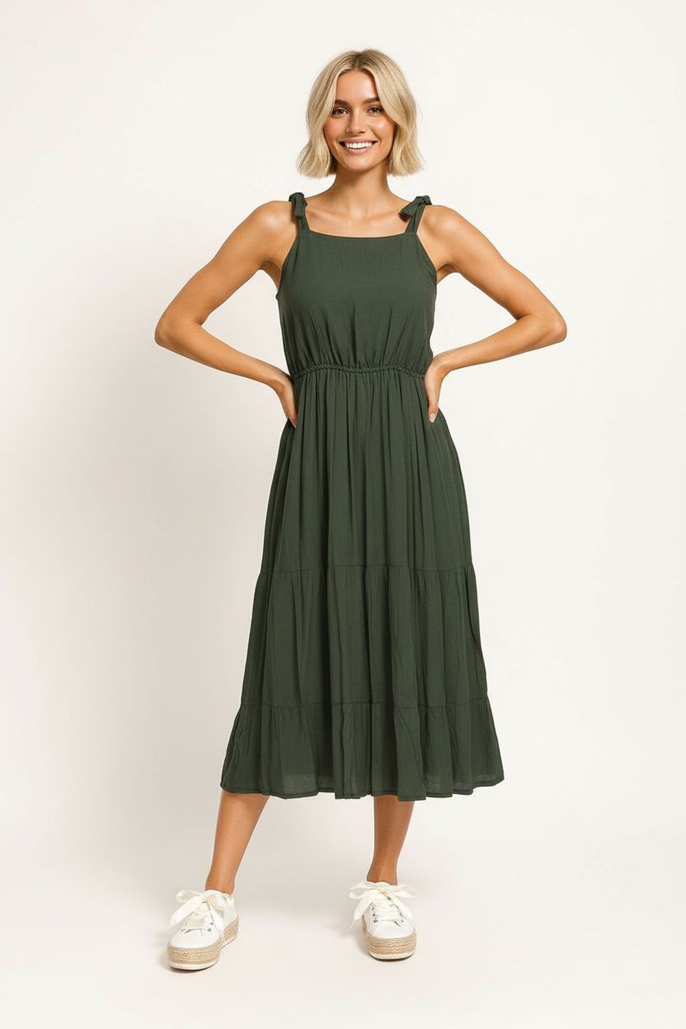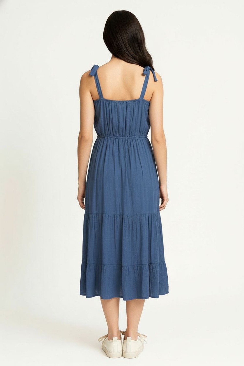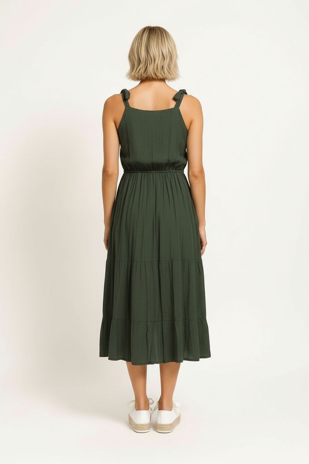 Vestido midi con tirantes ajustables mediante lazos que permiten acomodar la caída, escote recto que brinda soporte, corte fluido que facilita el movimiento, pretina suave que define el contorno, falda amplia con paneles que generan volumen natural, confección ligera ideal para uso diario